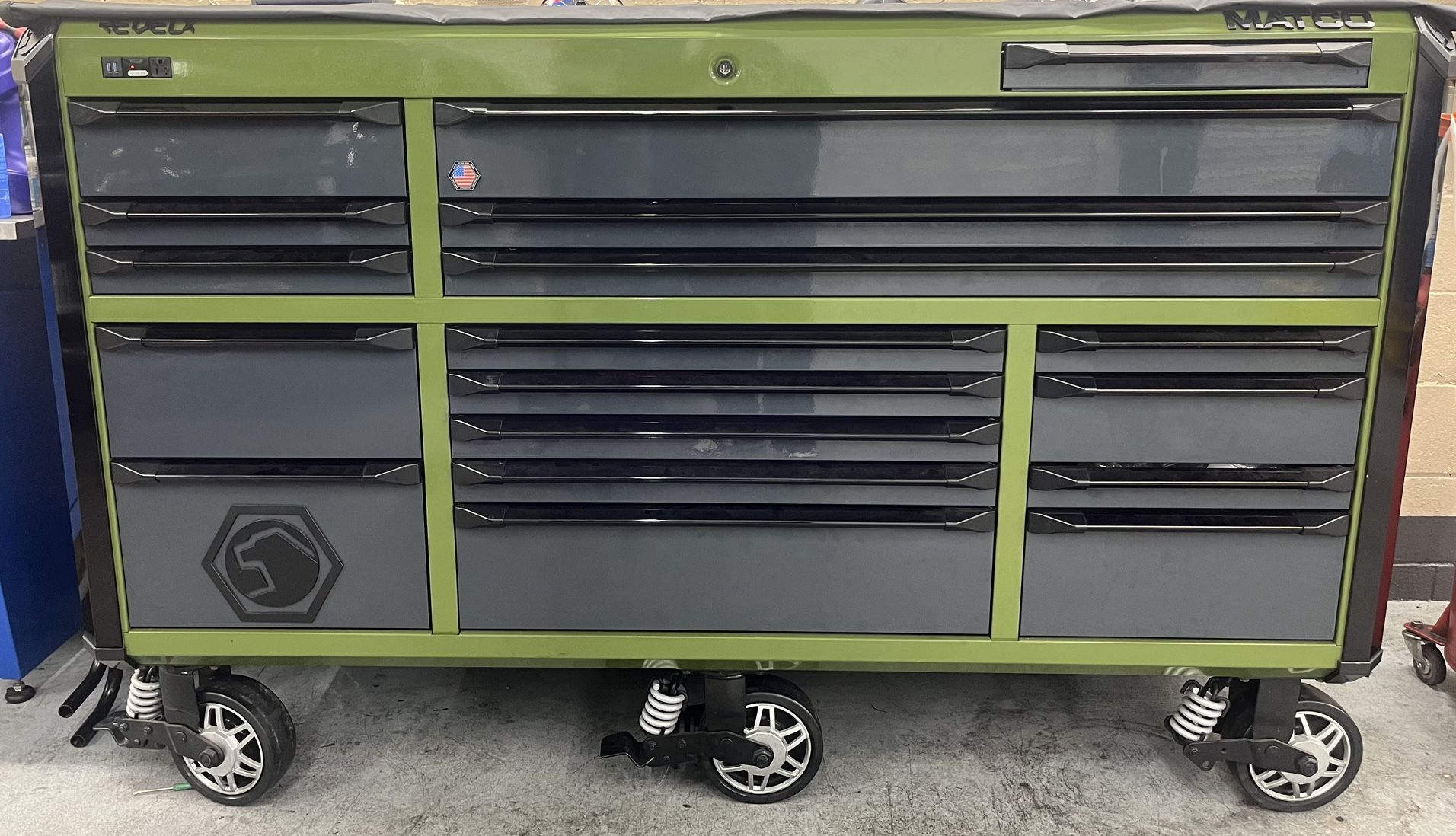 Army Green with Black Handles/Trim USA Made in Jamestown, NYC Comes with Matco Tool Box Cover More details to come but has power drawer and multiple drawers and 2 laptop drawers . Stands about 4ft tall 27inch wide & 78inch length