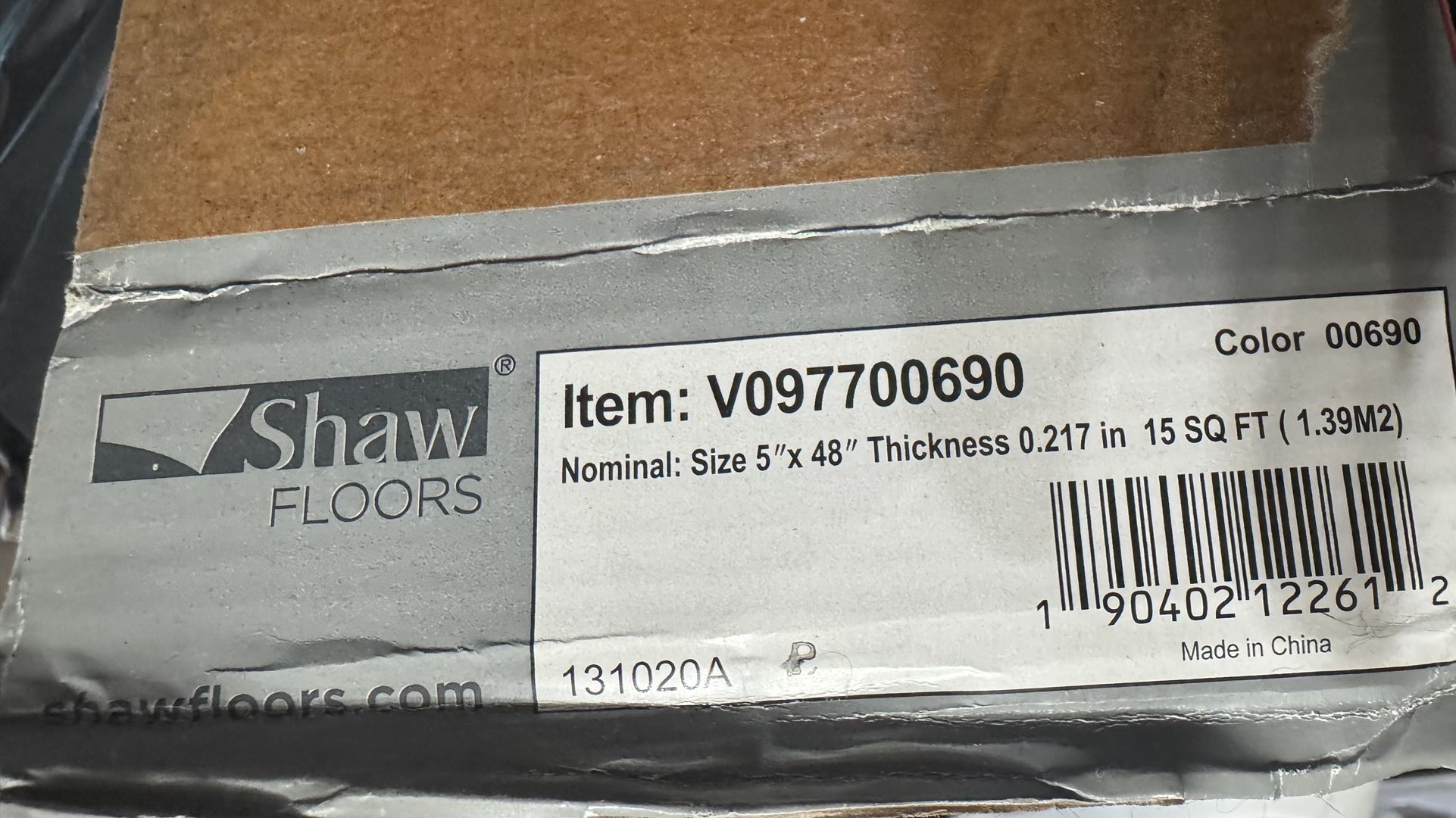Shaw Florte Pro 6 Series 75 sq feet unopened boxes. One piece with damage to the underside from cat scratches.