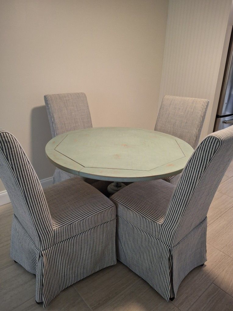 Great condition. Table is teal and chairs have a blue and white stripe fabric. Table is 30 high and 40 round.
