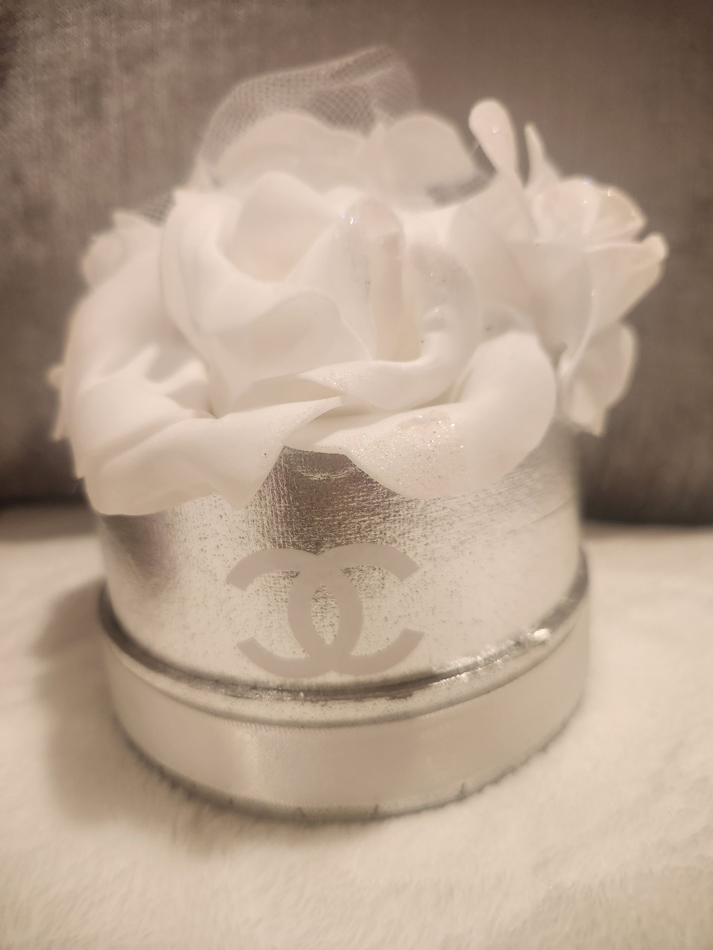 New silver glam vanity set with floral bouquet,2 glam candles,and silver crystal makeup brushes with holder! Shipping is available. Thanks!