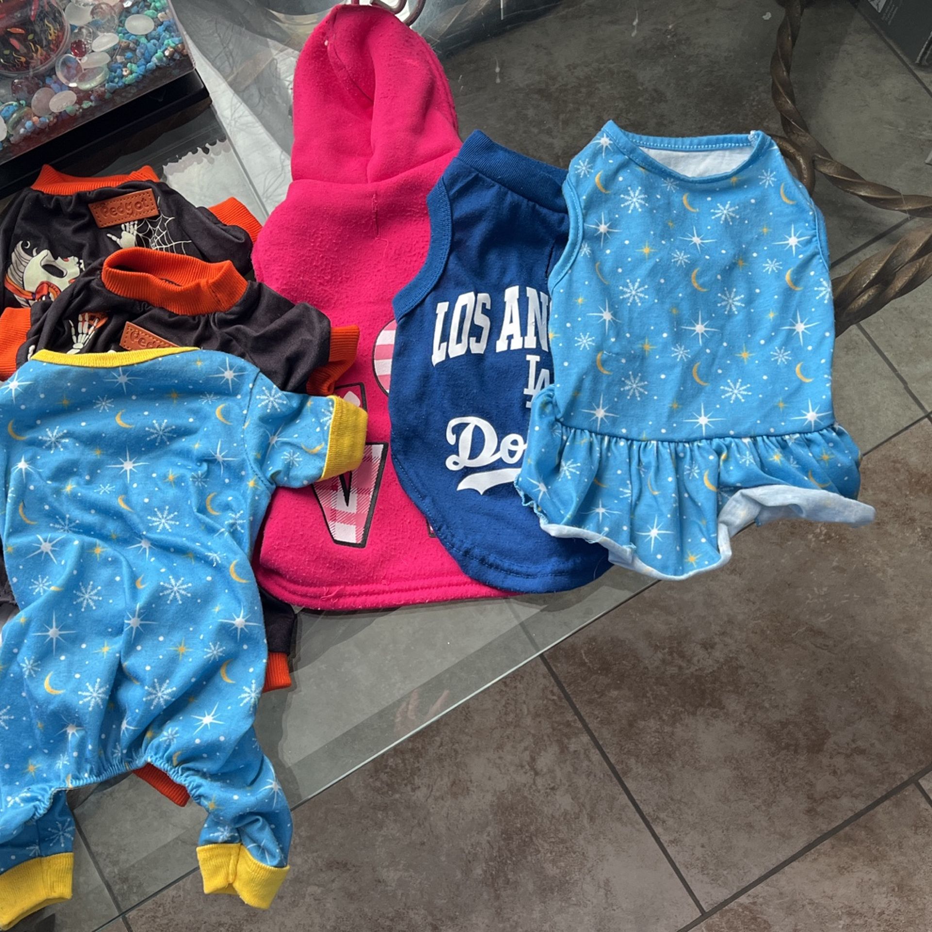 Items are 3 pajamas 1 dress 1 dodgers shirt and 1 sweater sold together or apart just make an offer