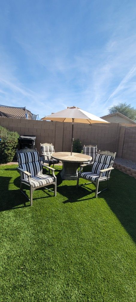 6 piece outdoor patio set. 4 stationary aluminum chairs with cushions, 1 round table with interchangeable marble pieces, and 1 umbrella. Pick up near 19th ave and southern. Price is FIRM. FCFS