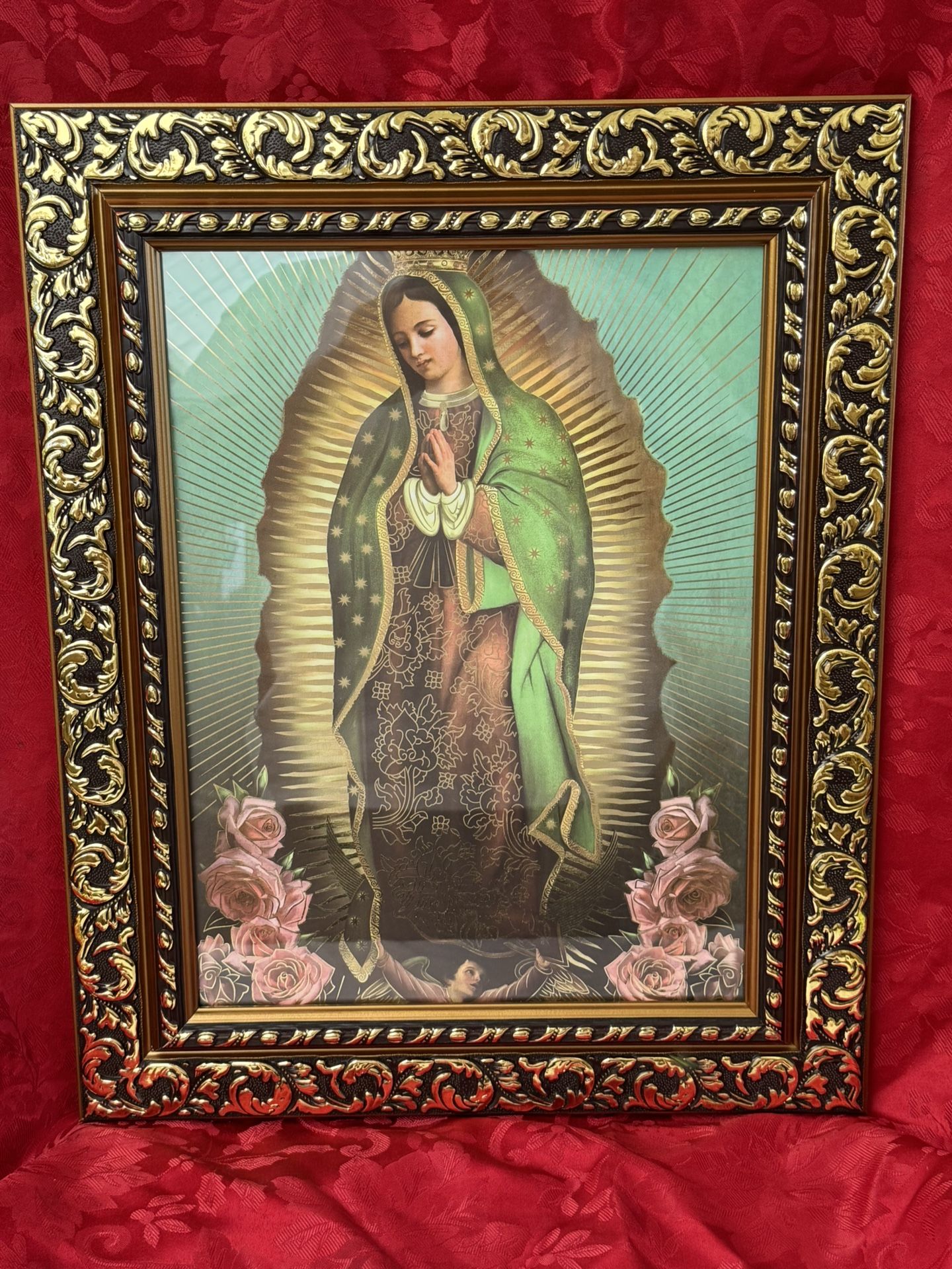 Cuadro de 20 pulgadas 3/4 de alto 16 pulgadas 3/4 de ancho 1 pulgada 1/8 de grosor Color oro y tiene vidrio enfrente Es una pintura de litografía La litografía es una técnica de impresión donde una imagen se transfiere de una piedra, metal o plancha a un papel o sustrato mediante presión y utilizando el principio de repulsión entre el agua y la grasa