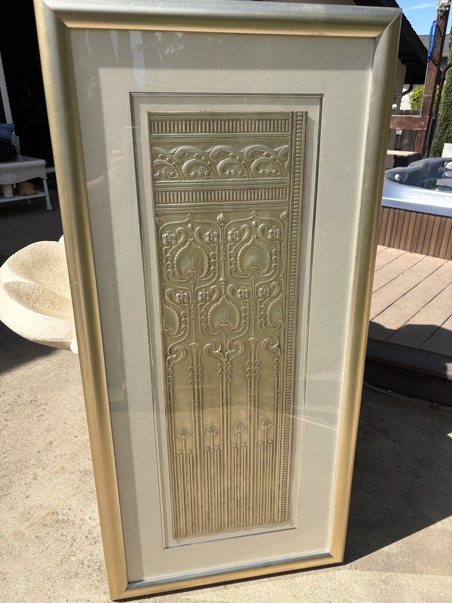 Beautiful large (53x25) framed decorative wall art featuring an ornate embossed pewter-style design (E. G. Cody framed and embossed pewter plate panel ). Originally custom framed for Noriega Furniture, this piece has an elegant classic look that works well in traditional, vintage, or eclectic interiors. Details: • Brand: Soicher-Marin Fine Art • Series: Pewter Plate Series • Style #: VM-1043 • Large decorative gold-toned frame • Elegant raised ornamental design • Vintage showroom-quality décor • Good vintage condition (minor age wear visible—see photos) Perfect for: • Living room statement wall • Entryway décor • Traditional or vintage home styling • Interior design accents Pickup only, in Clayton after 7pm on weekdays or flexible weekends Cash preferred , open to PayPal