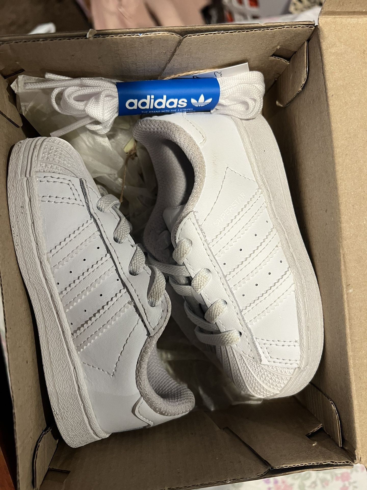 2 pairs of toddler sneakers size 6c for sale. Adidas superstar originals all white Jordans 1 mid black/royal blue