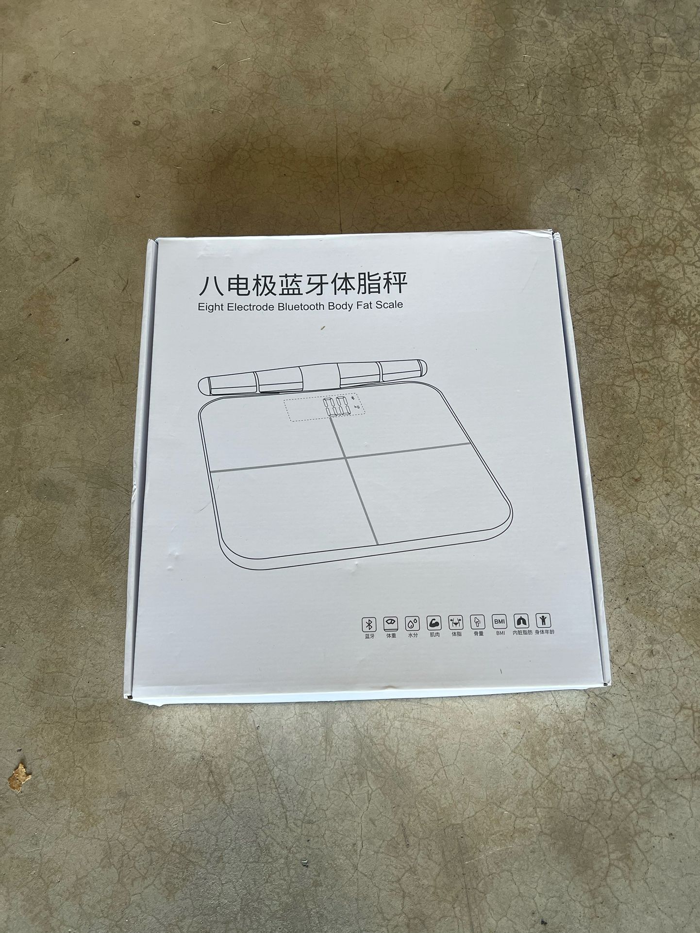 Basically NEW scale (eight electrodes). I create advertisement videos and took the product out of the box to get footage. There’s an app to download to track weight and other information. The box and most of the packaging is in Chinese, but I believe the app and scale can be set to English. It’s selling for $80 on their website, but I’m willing to sell for $25 cash.
