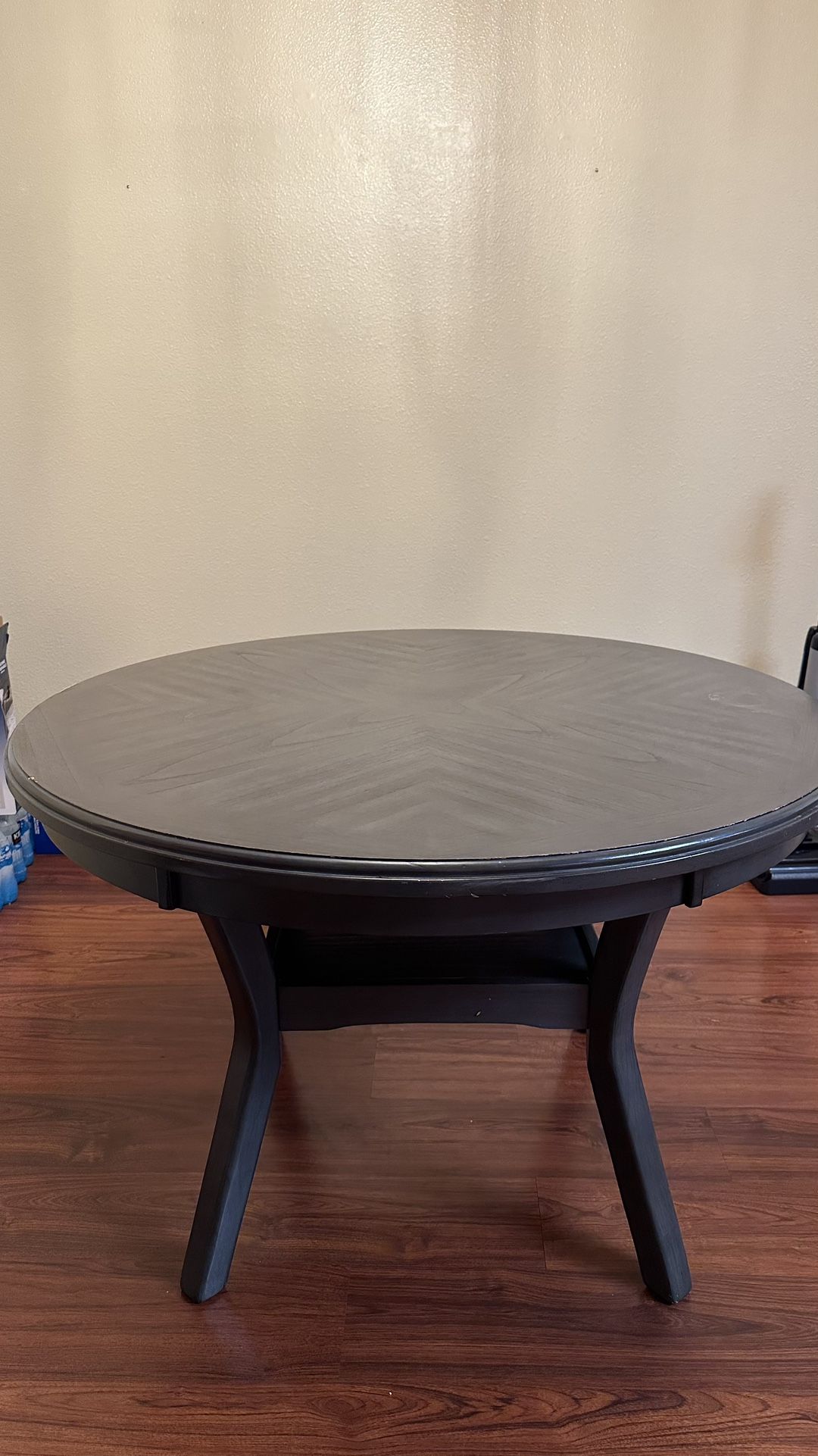 Dark grey round table, has scratches and chipped in some areas Has a mini shelf below table for storage 4 chairs, will need some cleaning Overall, sturdy table Measurements are in the photos