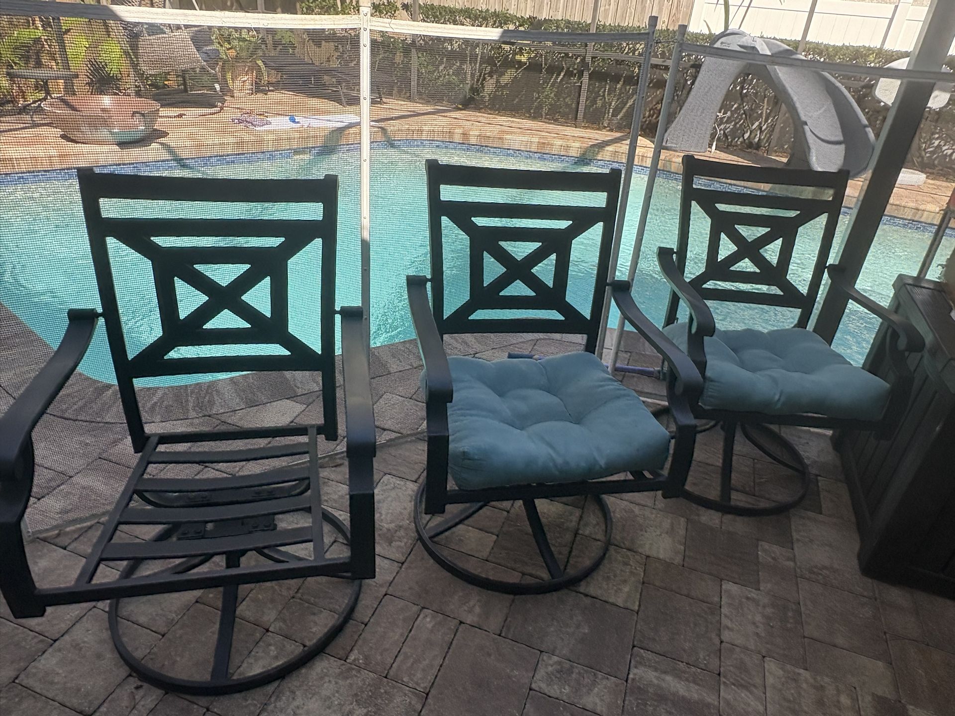 Selling a set of 4 Metal Outdoor Patio Chairs. Chairs swivel 360 degrees and rock back and forth. In good condition. Selling due to upgrading to a new set. Includes 3 blue cushions with minor wear and tear shown in photos. Missing 1 cushion Asking $200 or best offer