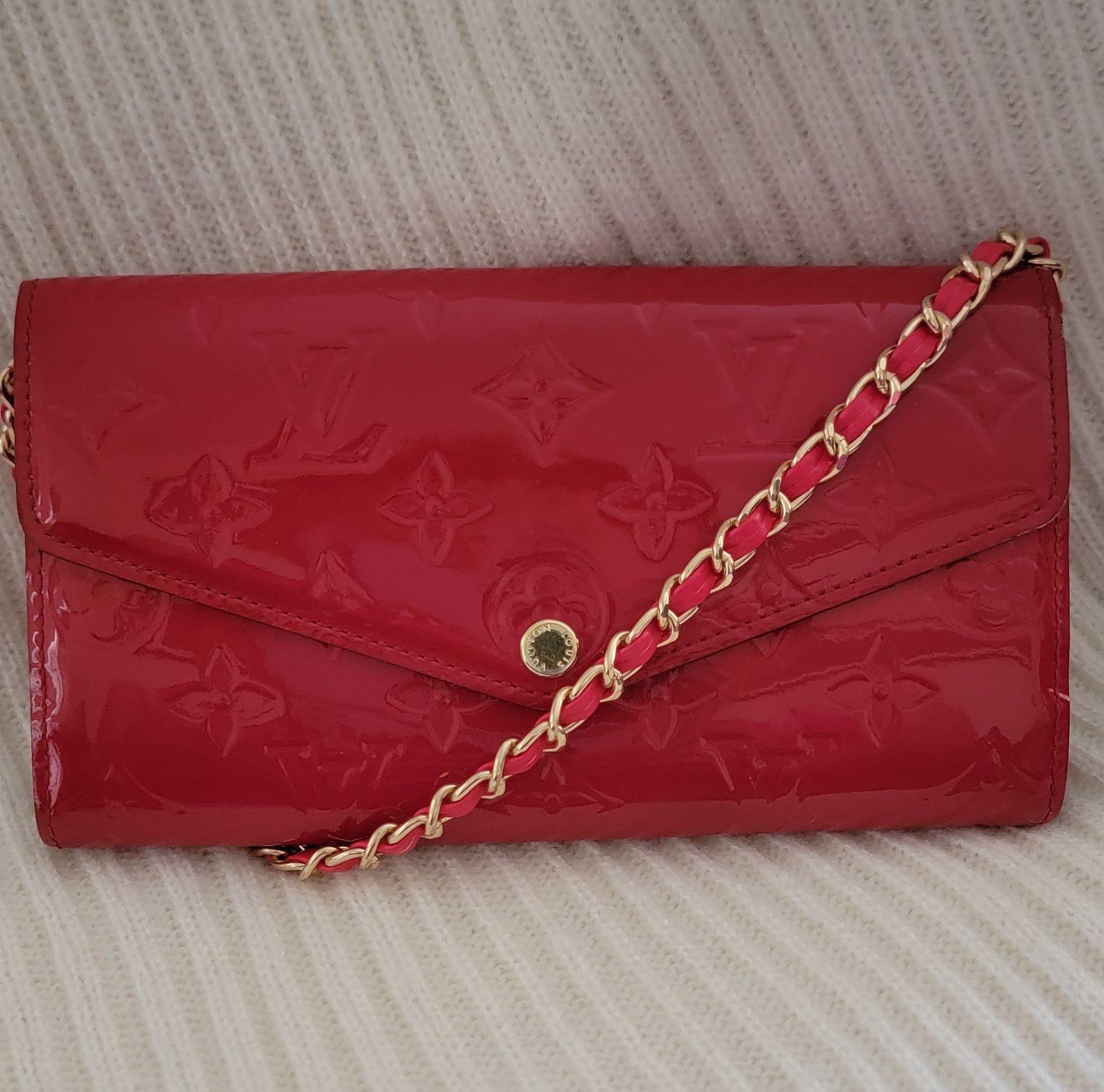 Louis Vuitton Sarah Wallet in Monogram Vernis patent leather, specifically in a color like Cerise or Cherry.