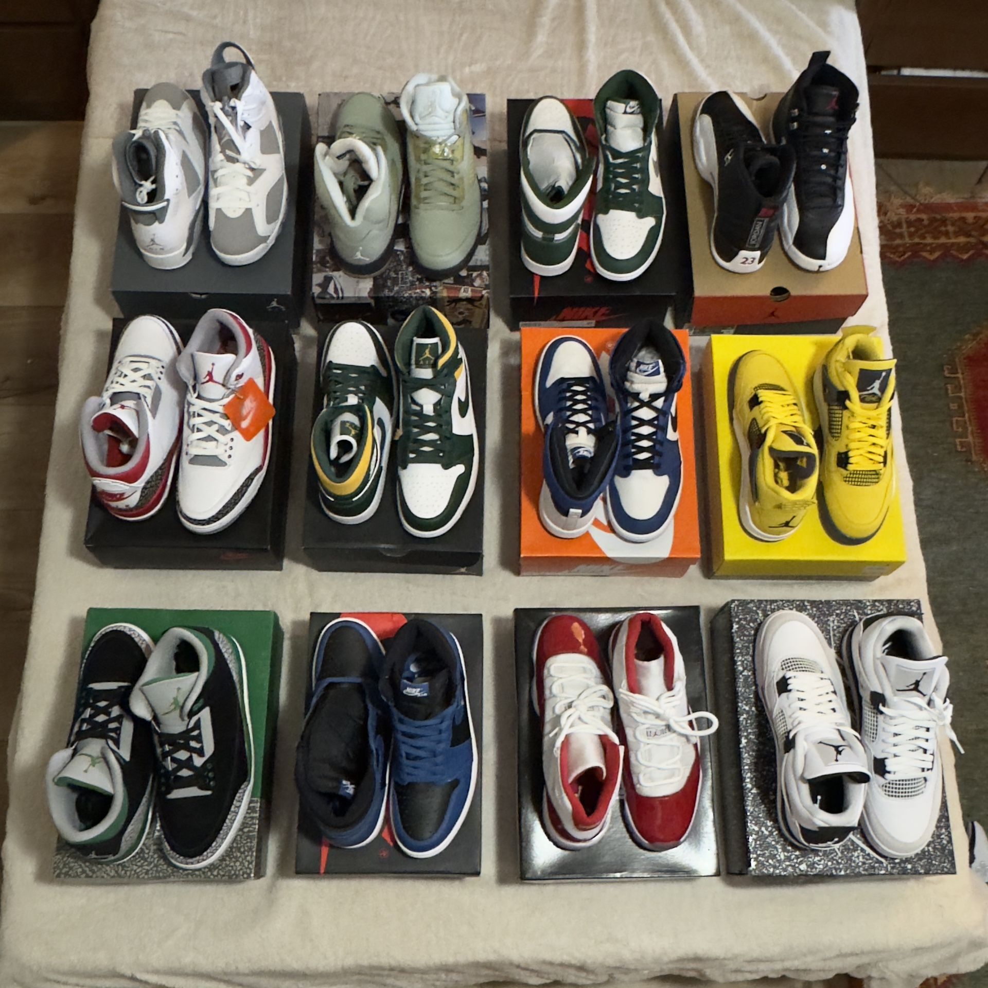I have 13 never worn Jordan's with a few different sizes. Comes with the original boxes. See prices and sizes below. Size 12: Jordan 4 Retro: Military Black - $400 Jordan 1 Mid: Sonics - $250 Size 11.5: Jordan 12 Retro: Playoffs - $350 Jordan 3 Retro: Pine Green - $350 Jordan 3 Retro: Fire Red - $300 Jordan 6 Retro: Cool Grey - $300 Jordan 5 Retro: Jade Horizon - $250 Jordan 1 Retro High OG: Gorge Green - $230 Jordan 1 Retro High OG: Dark Marina Blue - $220 Jordan 1 Retro AJKO: Storm Blue - $180 Size 11: Jordan 11 Retro: Cherry - $350 Jordan 1 Retro High OG: Dark Marina Blue - $220 Size 9.5: Jordan 4 Retro: Lightning - $350
