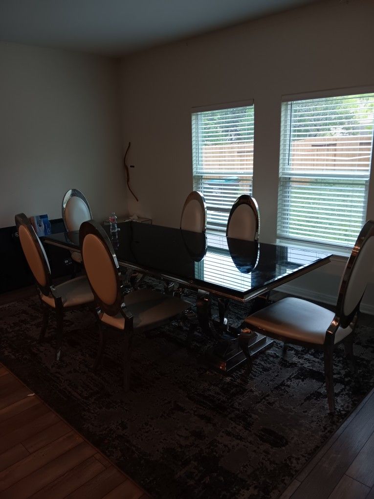 Elegant modern Black glass table with white leather seats and stainless steel, very modern, asking 800 OBO y MUST PICK UP TODAY CASH OR CASH APP ONLY YOU PICK UP