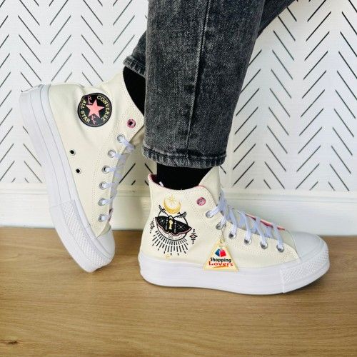 Stylish Converse high-top sneakers with unique celestial and graphic designs. Comfortable and durable, ideal for everyday wear. Drawing inspiration from alchemy and tarot card readings, platform Chucks get a spiritual update. Celestial graphics and embroidered details take your style to a whole new realm, while still staying true to iconic Chuck Taylor style. • High-Top Design • Textile Upper & Lining • Rubber Outsole • Celestial & Graphic Designs • Lace-Up Closure • Egret/Black/Coral Rose Colors 100% Authentic Brand Converse Color Egret/Black Style A08834C Size 7.5 Condition is "New with Box". Shoes in original box (box no top lid). Additional specifications, please see all pictures.