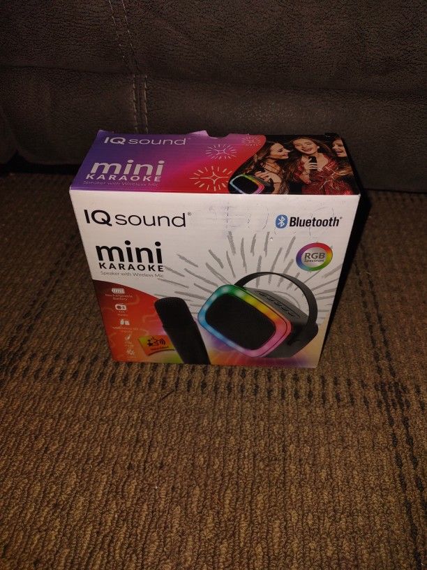 The IQsound® IQ-908K includes: • Portable Speaker • Wireless Microphone • USB-C Charging Cable • User Manual Features: • Charge Time: Up to 5 hours • Built-In Rechargeable Battery • FM Radio • USB/Micro SD Card Input • AUX Input (compatible with most devices with a 3.5mm AUX output) • Light Show (Five different modes of RGB lighting) • Voice Effects ( Five fun voice effects (Baby, Male, Female, Deep, Shout) Specifications: • Bluetooth Version: 5.3 • Transmission Distance: 10 miles • Speaker Output: 5W • Frequency Range: 60hz-20KHZ • Speaker impedance: 4ohm • Charging Voltage: 5V • Playtime: Up to 5 hours • Charging Time: 2.5 hours Local pickup only Cash only