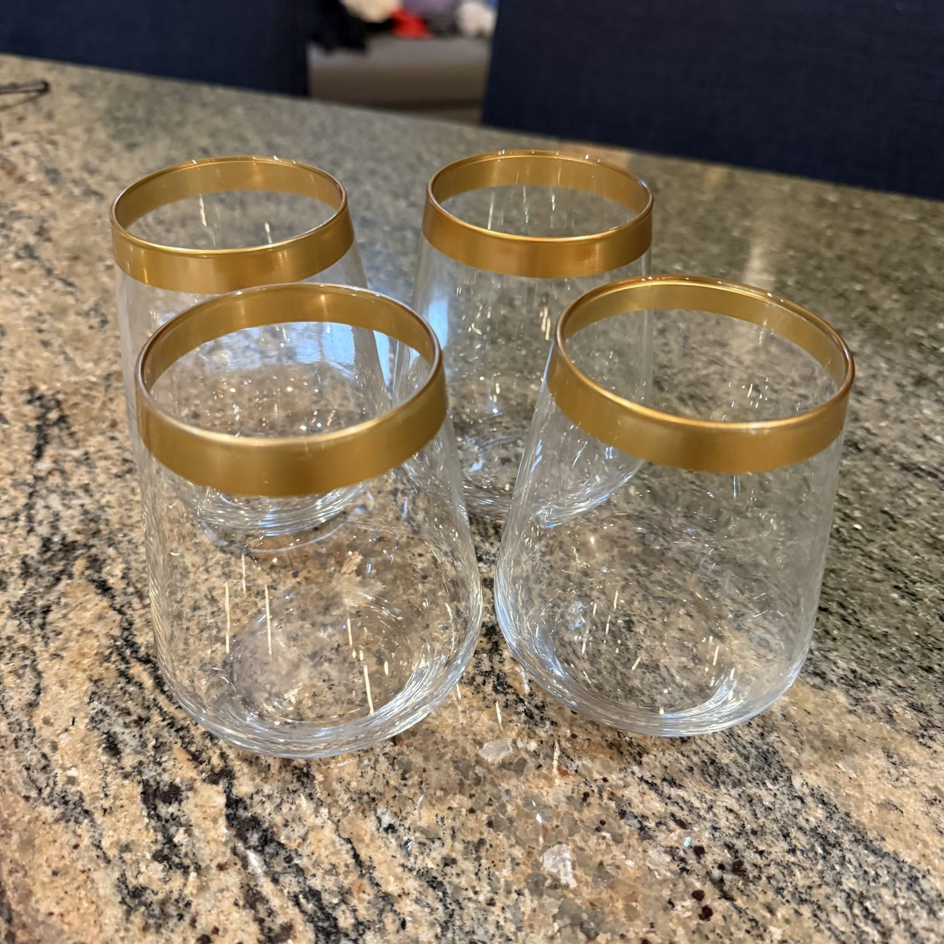 Porch pick up Woodinville. Bundle with other items & make an offer! Gently pre-loved set of four (4) clear stemless glasses featuring an elegant gold-tone rim. These glasses are in excellent condition with no chips, cracks, or repairs. Gold rims are intact with light, normal wear consistent with gentle use. Modern, versatile design suitable for wine, cocktails, whiskey, water, or mixed drinks. No maker’s mark present. Bottoms show a faint double teardrop swirl