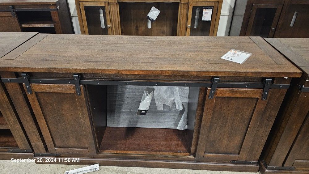 Delivery available for additional fee Width: 60.00" Height: 30.00" Depth: 20.00 A few scuffs or scratches floor model Made of veneers, wood and engineered wood with metal components 4 adjustable side shelves, 2 stationary middle shelves 2 sliding barn doors with wheels and track Industrial black finished hardware