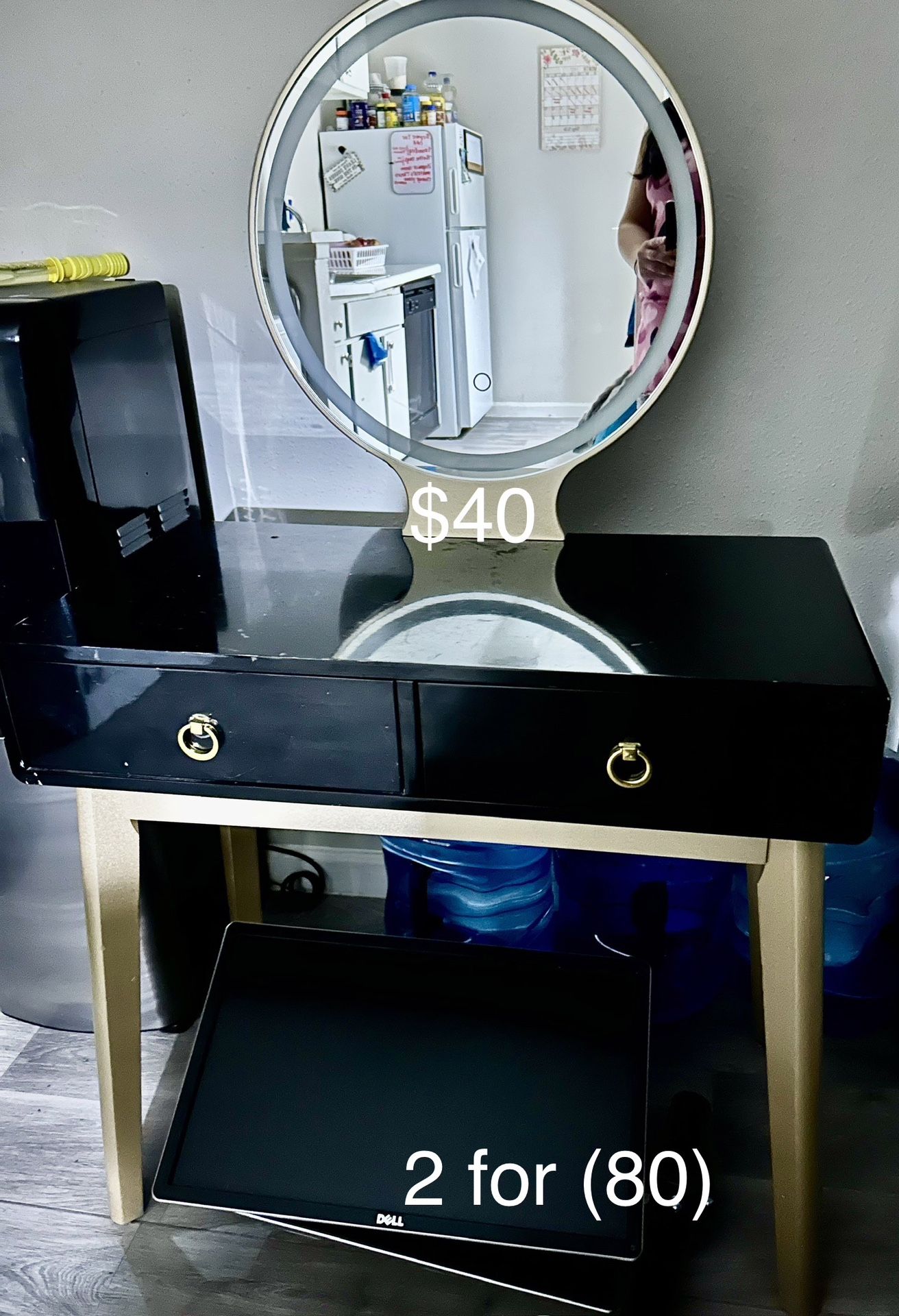 Vanity is fairly used with a few scratches. Lights on mirror still work you just need to purchase the plug for it. Has three different settings and dimming as well. The monitors are together and also would need plug purchase. I do not have it available.