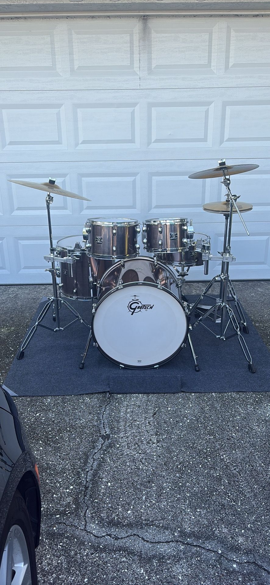 Really nice Gretsch energy drum set! Comes with a set of SBR Sabian cymbals. 13 inch high hat., 16 inch crash, and 20 inch ride. Comes with a brand new set of heads on the snare drum., the Tom Tom, and the floor tom. 14 inch air drum., 10 inch, 12 inch Tom Tom, and 16 inch floor tom. 22 inch bass drum.. comes with all Gretsch hardware and a PDP seat. Basically everything in the pictures comes with this set except for my rug..