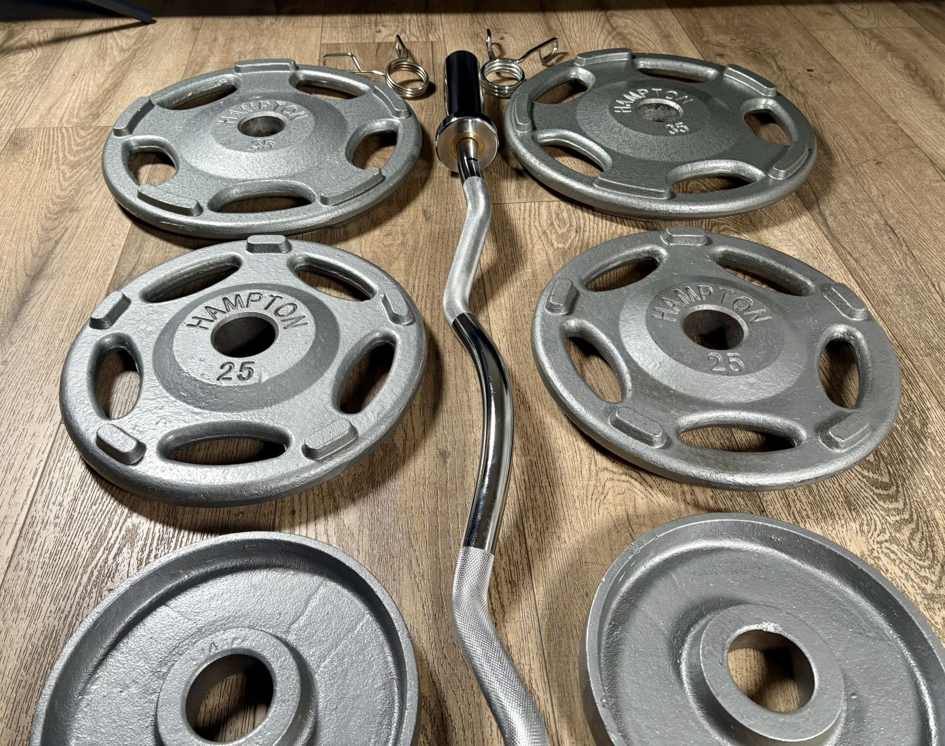 A Beautiful Classic. All Hampton but the 5s (IGX) and 10s (IVANKO) Price of plates: $290 Price of bar (buying the plates) $70 Price of bar alone: $85 To expensive? … look for average weight plates: pretty sure you will found on my profile those. (2) plates 35 lbs (2) plates 25 lbs (2) plates 10 lbs (2) plates 5 lbs (2) plates 2.5 lbs (1) Curl Bar 20 lbs (2) Spring clips Total: 175 lbs.