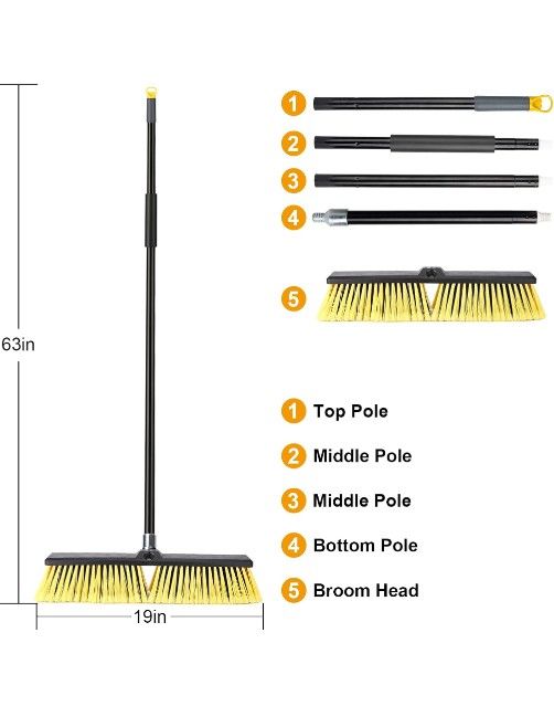18 Inches Push Broom Outdoor- Heavy Duty Broom with 63" Long Handle for Deck Driveway Garage Yard Patio Concrete Floor Cleaning Extra Long Handle push broom outdoor - Garden broom with 63" long handle comes in four sections , 45°angle, ergonomic design, reduce the pain in the knees and back while do housework,stiff broom head and the handle are in threaded connection, which is not easy to loosen. 6 Layer Hard Bristle -The garage broom is finished with 6 Layer stiff bristles for sweeping heavy things with forward speed or efficiency,such as grass, soil, sands, snow, leaves which tend to stick to the ground,plus ,it is suitable for using in wet or dry conditions,won't be rotten and deformed like a wooden broom. 18" Wide Stiff Broom -The shop broom has great width for sweeping wide area with a generous amount of bristles ,it has two handle slot ,can be swapped sides if you find the bristles are wearing unevenly. Easy to Care - Wash outside broom with clean water after each use, special little brackets that allow you to attach the broom-head to the broom handle, can be locked when not use, can hang on the wall which save your storage space. Multipurpose broom for outdoors -The angled design is easier to push than upright brooms,versatilely clean many types of rough floors in warehouse, garage, balcony, deck, pool, garden, patio, porch, sidewalk, stadium and more.