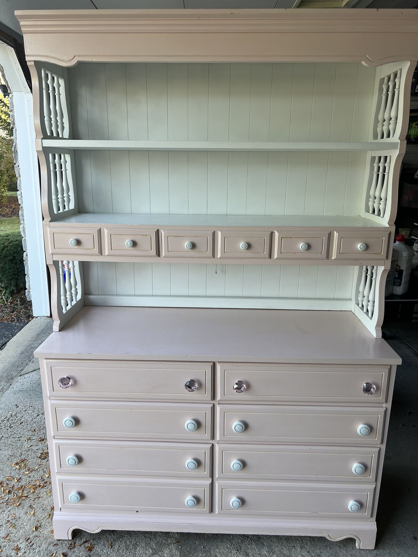 Pink and white dresser with removable hutch. Two outer drawers in hutch are usable. Middle is fake due to a light. The light does not work. All dresser drawers glide nice. Pick up in Carol Stream
