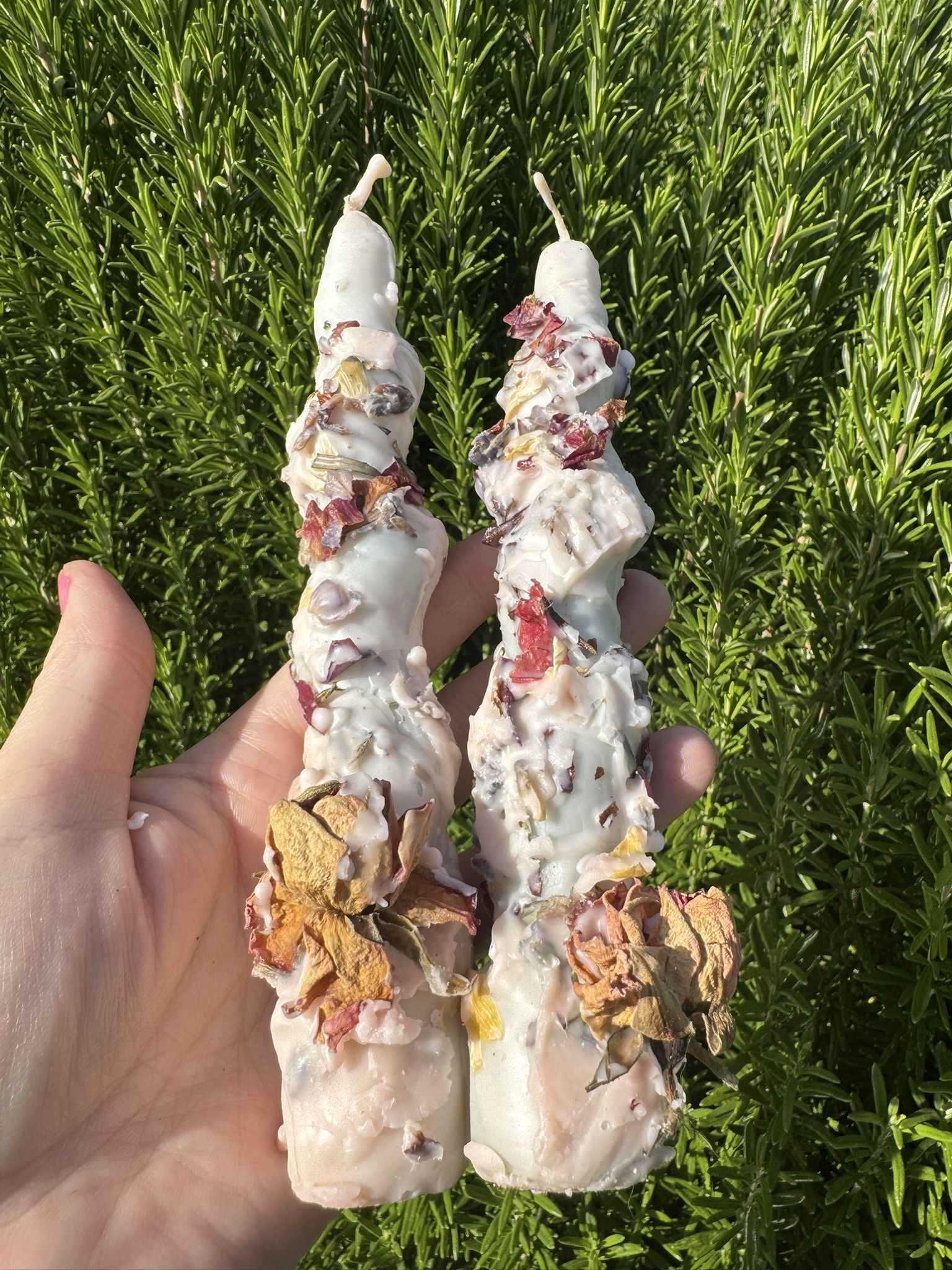 Two scented manifestation candles. Green on the inside to work with your heart chakra, soft pink on the outside. Rolled in lavender and roses and scented with mulled wine. Will ship for $8 pick up in La Habra