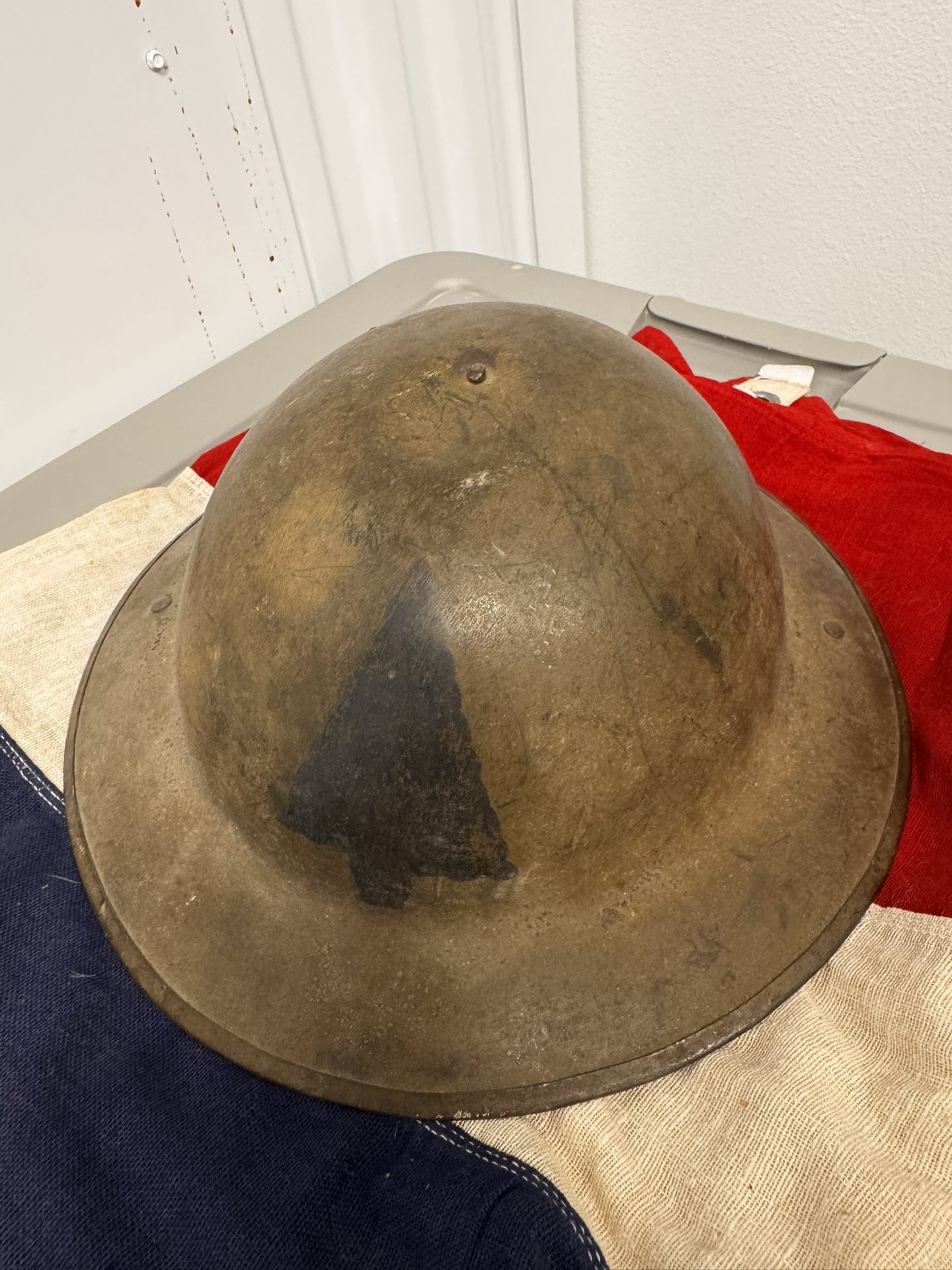 This good-very good quality WWI US Helmet retains some of its original color and has one medium sized dent on the top with scratches throughout the helmet. Leather is quite dry with its 100+ year aging and stills has much of the comfort fur for the head on the top part of the inner helmet.