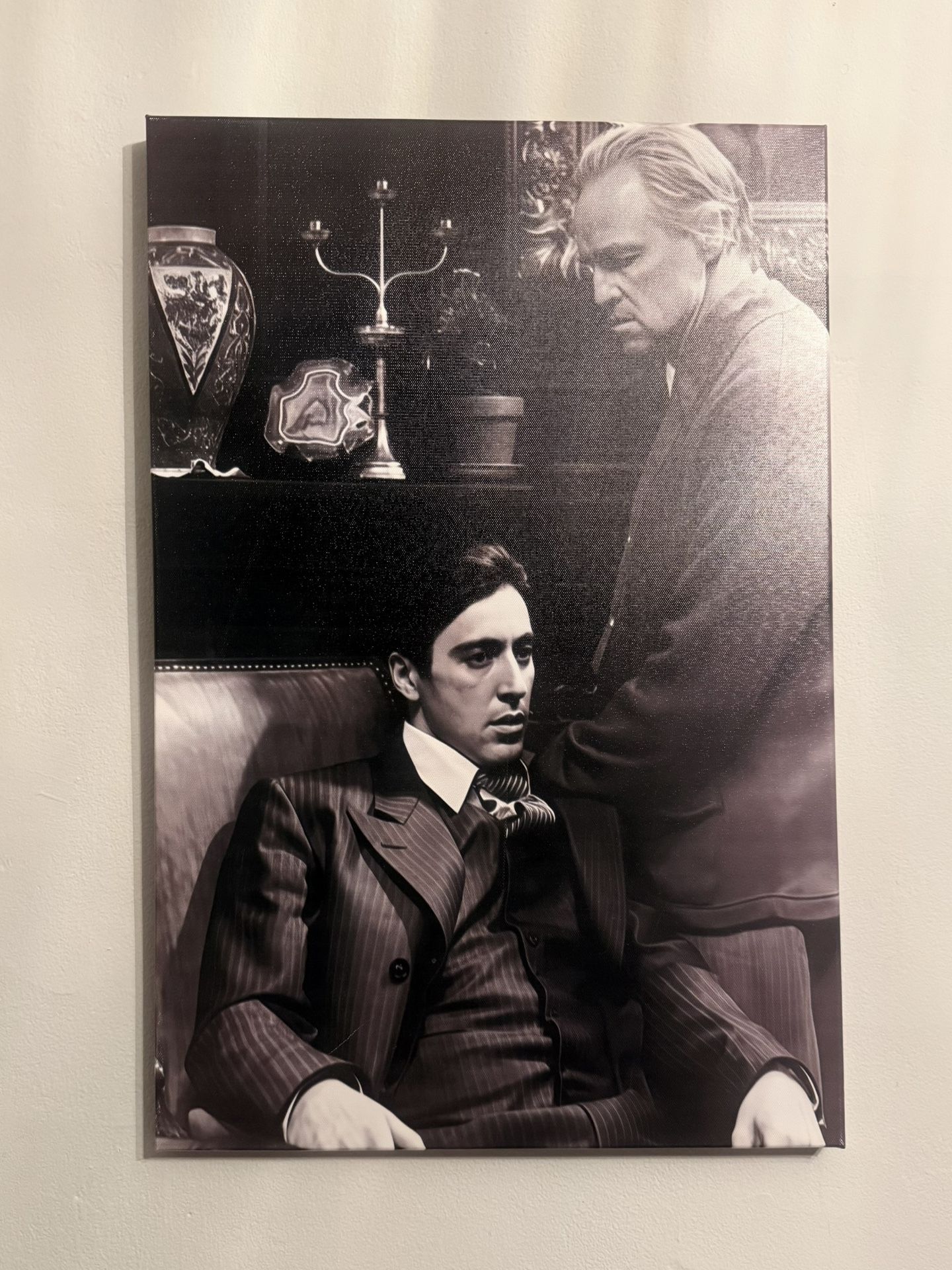 Brand new 16x24 black-and-white stretched canvas wall art featuring a classic Godfather-style movie scene. This is a gallery-wrapped canvas print (stretched over a wood frame on the back), not an external framed piece. Clean, modern look and ready to hang as-is. High-quality durable canvas with sharp detail and a timeless cinematic aesthetic. Perfect for a living room, bedroom, office, dressing room, hallway, or media room. Details: • Size: 16 x 24 inches • Stretched canvas (no outer frame) • Black & white design • New condition • Smoke-free home The photo shown on the wall is for display purposes only. The item being sold is brand new and still boxed. Local pickup. Message me if interested.