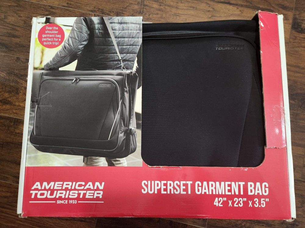 Brand new, unused, American tourister superset garment bag. It measures 42"×23"×3.5" box is slightly damaged but product is brand new. Perfect for easy packing travelers.