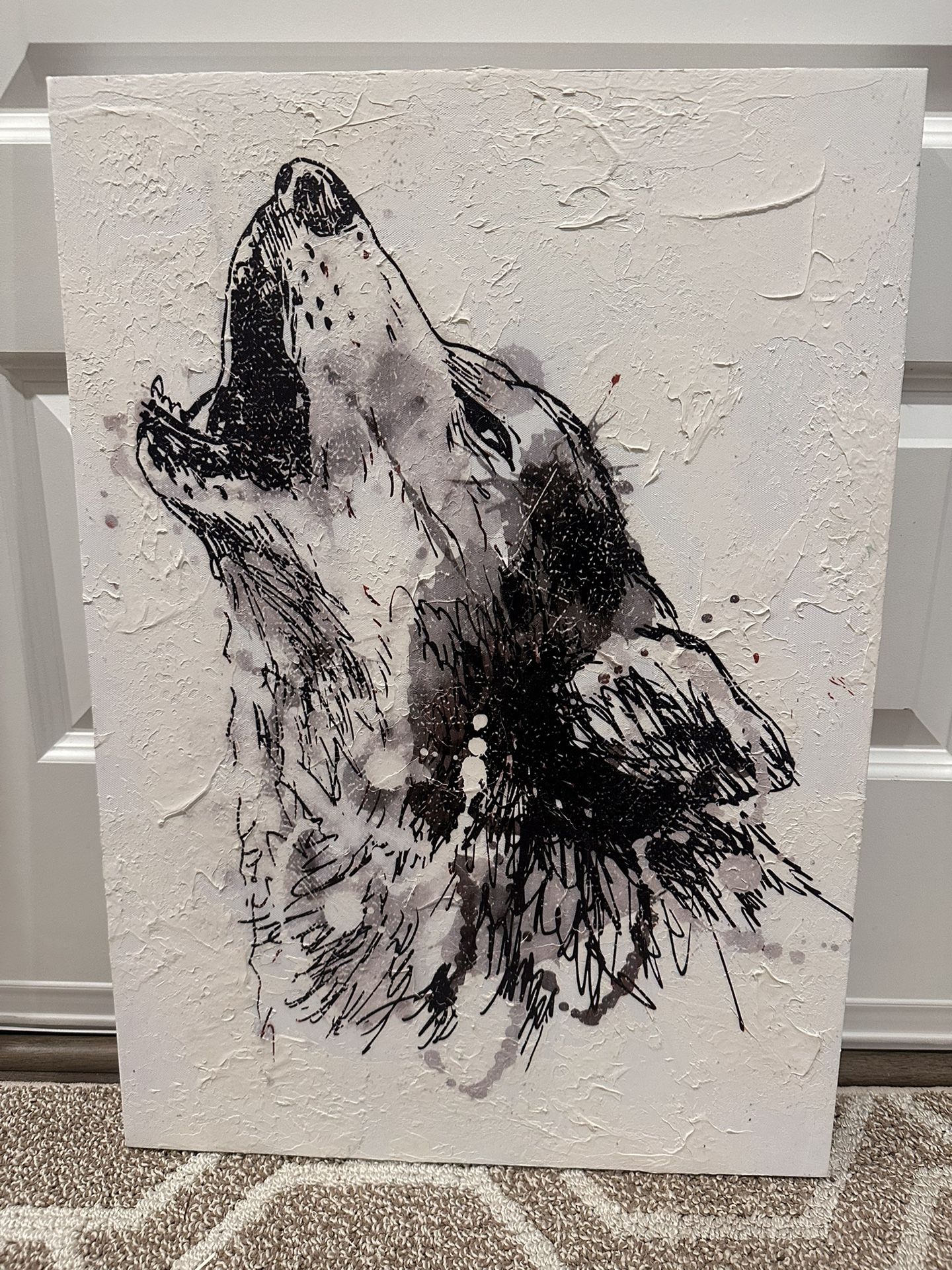 Textured wolf print on canvas, 17” wide, 24” tall, 1.25” deep. Comes from a pet-free/smoke-free home. Can meet on South Hill (Puyallup) or downtown Puyallup. Cash only.