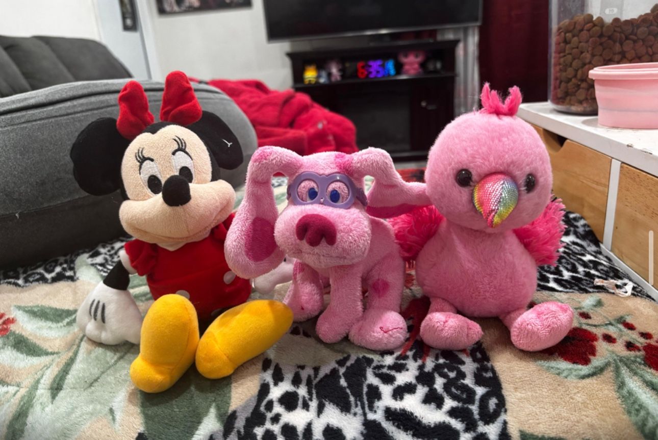 Dog plushy, flamingo, plushy, mini mouse plushy 4 inches, 3 inches for them no damaged at all