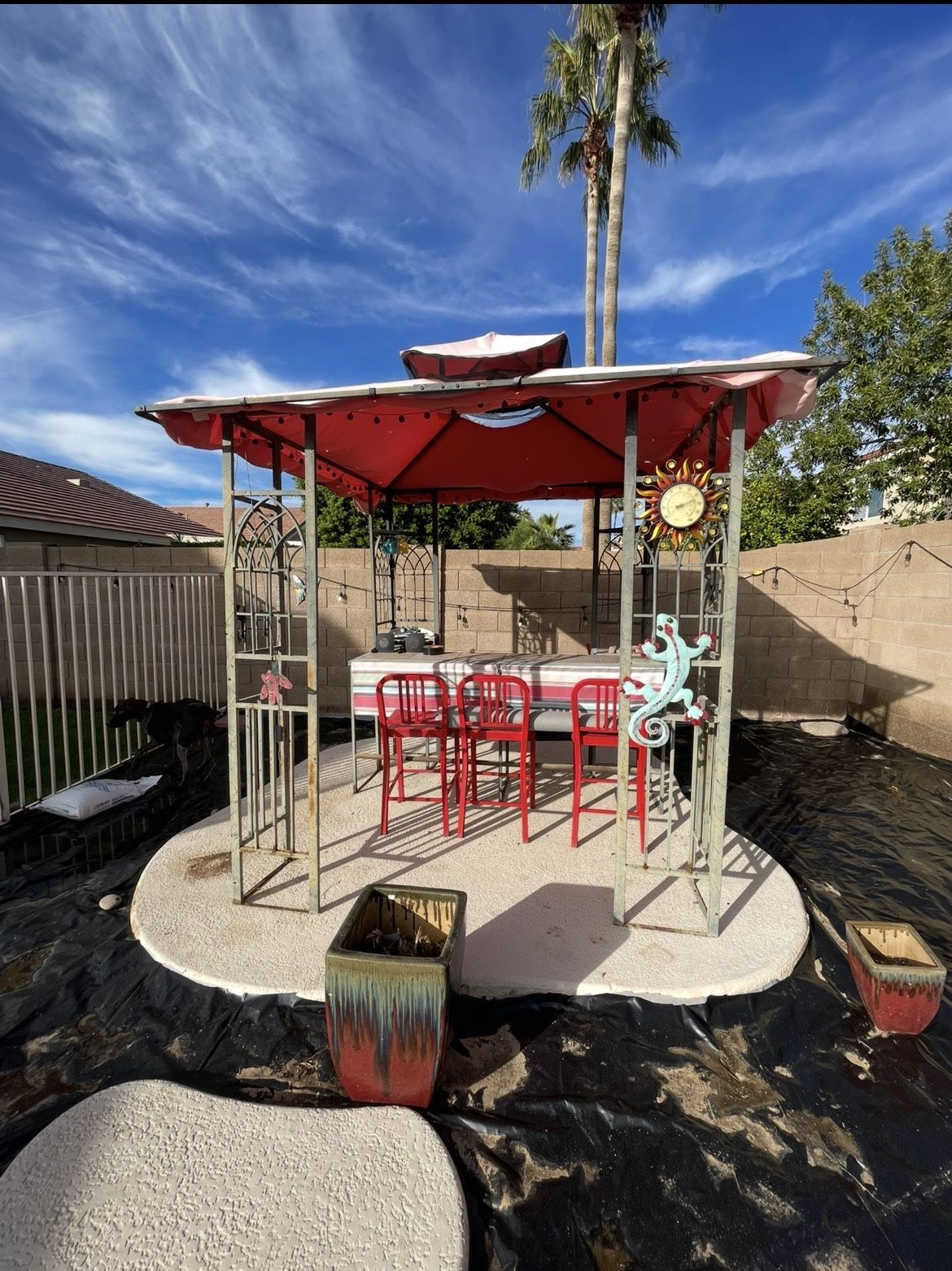 Add some fun to your backyard with this durable metal bar with a footprint of 80“ x 80“. It stands 7 foot with a 9 foot center height. Included are 4 metal red bar stools along with the canvas roof (which is faded red). The bar has a shelf in it as well as shelves in the corner supports…It has been broken down to fit in a truck and taken away.