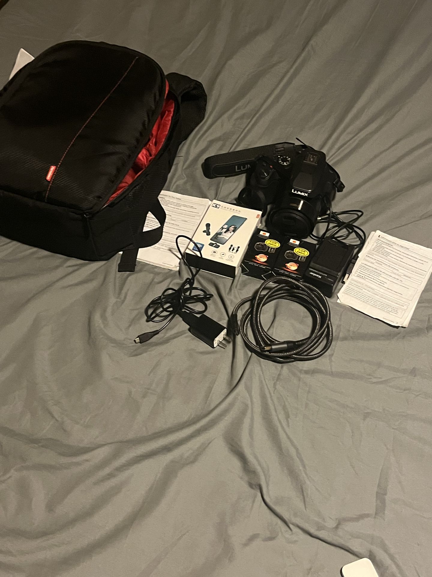 Selling my Panasonic LUMIX FZ80 4K in really great condition only used it 4 times This camera has a 60X Zoom (far distance ) What’s in this bundle: 1 Panasonic LUMIX FZ80 4K 1 original charger that came with the camera The Extras: 1. 4k SDCARD so you can use the camera right away 1 Backpack for Camera 1 plug in external charger 2 extra batteries for external plug in charger 1 pack wireless mic with 2 microphones that hooks to the people in the video and adapter for your phone for better audio because your phone can connect to the camera and you can interact with it that way as well (very useful) 1 HDMI to HDMI mini to view your recordings on your TV in 4K if you don’t want to use the SD card and also note it will still work with 1080P or lower resolution Also note: I do have a manual in English and Español, however, it has seen better days lol Also, if you’re wondering with the original battery, I have 2 extra so it’s a total of 3 batteries