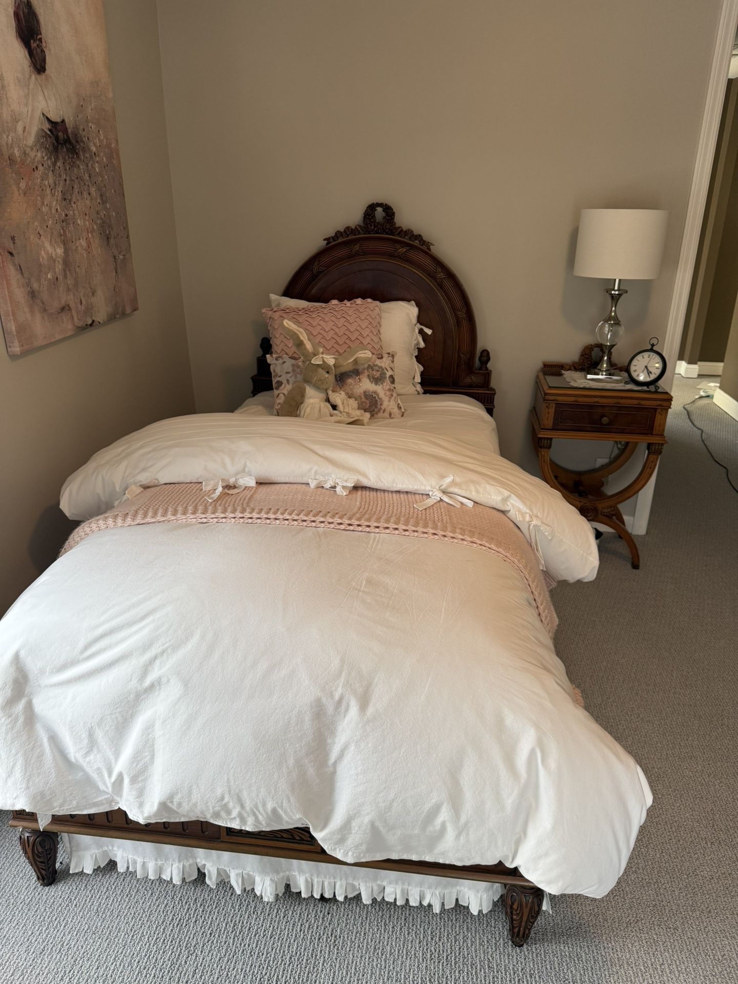 SET INCLUDES : Two Twin Bed 54”Hx42”Wx78”L Hook and latch side rails with wood slats Bedside Table With Dovetail Drawer 33.5Hx18”Wx13”D Vanity 32”Hx51”Lx19”D 7 Dovetail Drawers Mirror 52”Hx26”Hx1”D One Box Spring and Mattress Set Clean Smoke Free and Pet Free Home SELLING AS A SET ***Will sell one twin bed separately $300*** Cash or Zelle