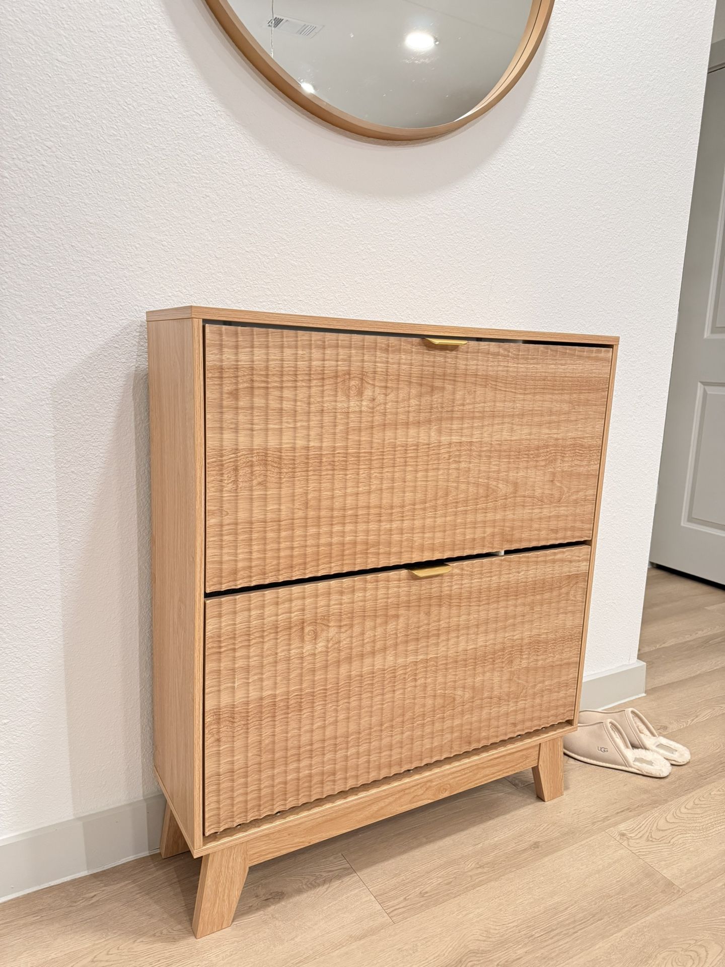 We only had for 1 month, we are moving out of State im the next 2 weeks. The shoe rack cabinet can store up to 16 pairs. Measuring 31.5"x 9.45"x 37", it is equipped with 2 flip-out drawers, each drawer containing two layers of storage space.The top is ideal for placing potted plants, ornaments and keys, without worrying about falling Send offers and we can possibly negotiate!