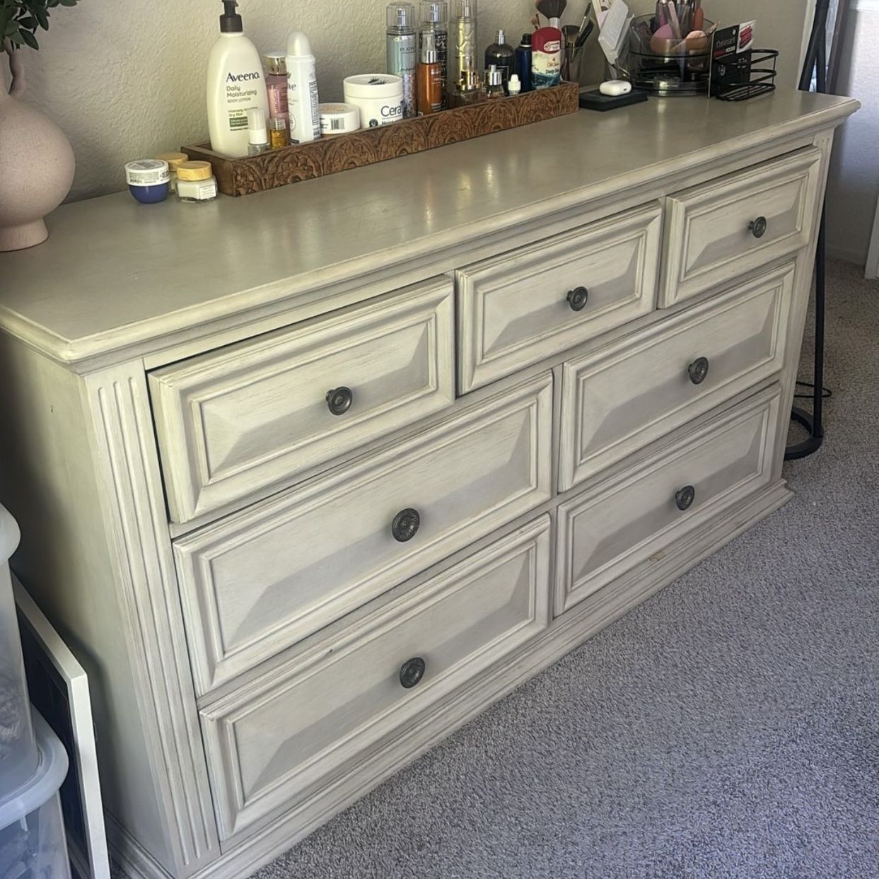 Solid wood Dresser with 7 drawers Heavy and sturdy double dresser All drawers slide perfectly Dimensions - 64W 38H 19D The top has blemishes other than that no issues We are selling this only because it’s too big for our space.