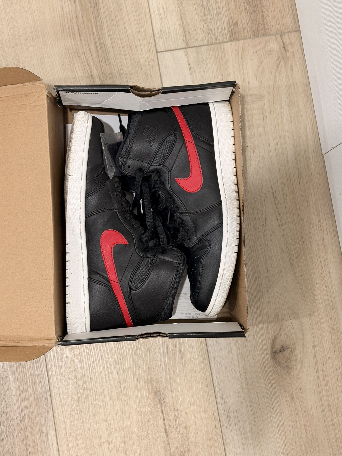 Black/red. Used and have a crease from being worn but otherwise in good condition. Comes with changeable tongue logos