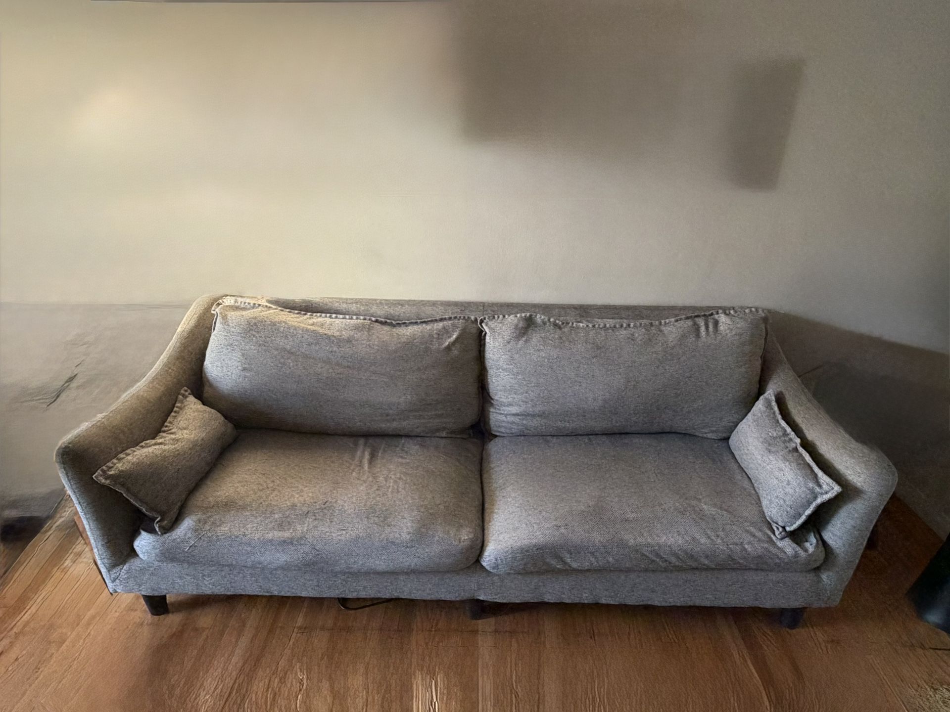 Couch for sale from all modern. Grey (small black and white pattern up close) Cushion covers on seat and back are removable and washable. Legs below the couch removable and there is a storage pouch built in. Arm fabric slightly worn, but all still sturdy. Buyer must be able to come and pick it up.