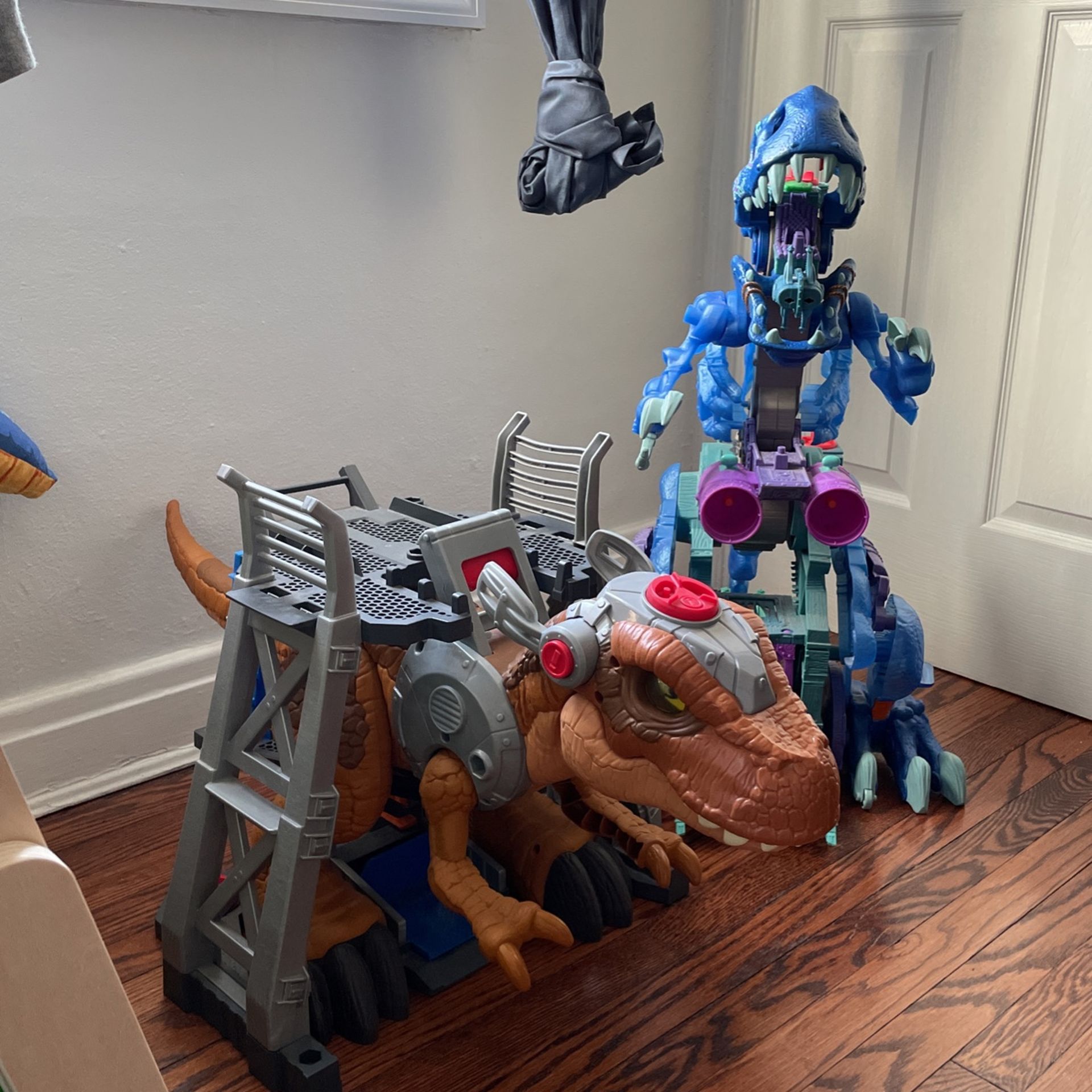 Two used extra large Imaginex T-Rex dinosaur toys. They are 2-3 feet each. They are animated (lights and sounds) and work. They did come with some extra accessories that my kids lost along the way. It will come with some projectiles (arrows/balls) that shoot from the Dino’s and the brown TRex comes with a vehicle. $20 each. On Amazon and other sites these Dino’s are selling for significant $$ on the used marketplace.