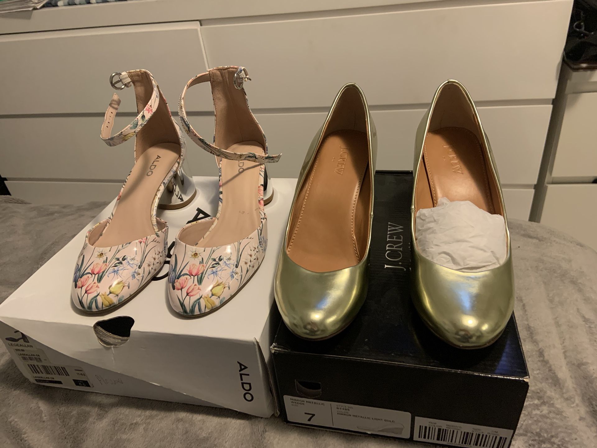 New Ladies Shoes. Designer J Crew Gold Wedge Or Aldo Spring Flowers $40 Each