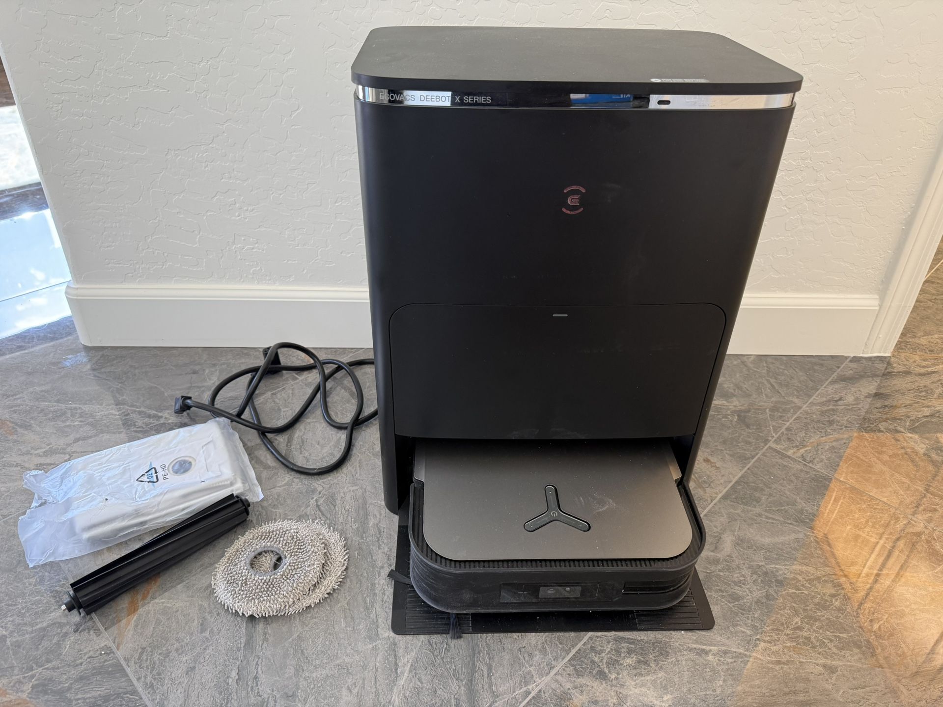Vacuums and mops at the same time! I love this machine. I’m selling because I bought the new model. Comes with new mopping pads, filters, roller wheel and filters. Ultimate Hands-Free Cleaning: ECOVACS OMNI station offers a fully automated solution. It self-empties with a large dust bag that holds up to 90 days of dust, while also washing wipes with 131°F hot water to ensure cleanliness. Additionally, it refills the robot's built-in water tank with clean water to cover up to 4300 sqft (400 sqm) and uses hot air to dry the mop after each use, preventing unpleasant odors. 8000Pa Powerful Suction with Extra-Long Roller Brush: Ecovacs features a longer 200mm main rubber brush for more efficient cleaning. Made of rubber, it minimizes hair entanglement and, combined with its 8000Pa powerful suction, swiftly and effectively collects crumbs, hair and dust on both hard floors and carpets. Ideal for homes with pets. Intelligent 15mm Auto Mop Lifting: With ECOVACS' latest innovation, the X2 OMNI can automatically raise its mop by 15mm when it detects carpets. This prevents unnecessary mopping on carpets and simultaneously increases suction power for efficient carpet cleaning. Enjoy comprehensive cleaning without compromising on convenience. AI-controlled AIVI 3D 2.0 Obstacle Avoidance: with fully integrated AI and sophisticated machine learning, the robot can "learn" and "think" to achieve more flexible and accurate dynamic obstacle avoidance (such as fast-walking people and semi-open doors), as well as a more thorough cleaning in complex household in both bright and dark environments. Industry's First Dual-laser LiDAR Navigation: The X2 OMNI is the pioneer in robot vacuum technology, featuring a fully integrated LiDAR sensor. Its dual laser LiDAR sensor can detect objects up to 10 meters away at a 210-degree angle, making it smartly navigate, avoid obstacles, and map cleaning paths in your home. Plus, it creates detailed 3D maps for precise and personalized cleaning. In addition, the X2 OMNI is become flat and slimmer than traditional LDS robot vacuum, which allows it to easily glides under beds and sofas for hidden dirt. Dual Rotating Mopping System: The upgraded OZMO Turbo 2.0 Rotating Mopping System mimics human hand movements, with a rapid 25,000 RPM motor. It exerts a consistent 6N mopping pressure and spins at 180 rotations per minute. This powerful combination deep cleans effectively, removing stains from everyday spills to stubborn dried-on messes. Seamless Interactive Experience with ECOVACS: The X2 OMNI offers an unparalleled level of control with its self-contained YIKO 2.0 voice assistant. There's no need for additional connections to Amazon Alexa, Google Home, or Siri. Activating and operating the DEEBOT X2 OMNI is always a breeze, enhancing the enjoyment of your robot vacuum. Live Video Monitoring and Two-Way Calls: The Starlight Camera lets you watch your home in real-time and have video chats to keep an eye on your family and pets.(Product privacy protection certification ensures your privacy and data security.)