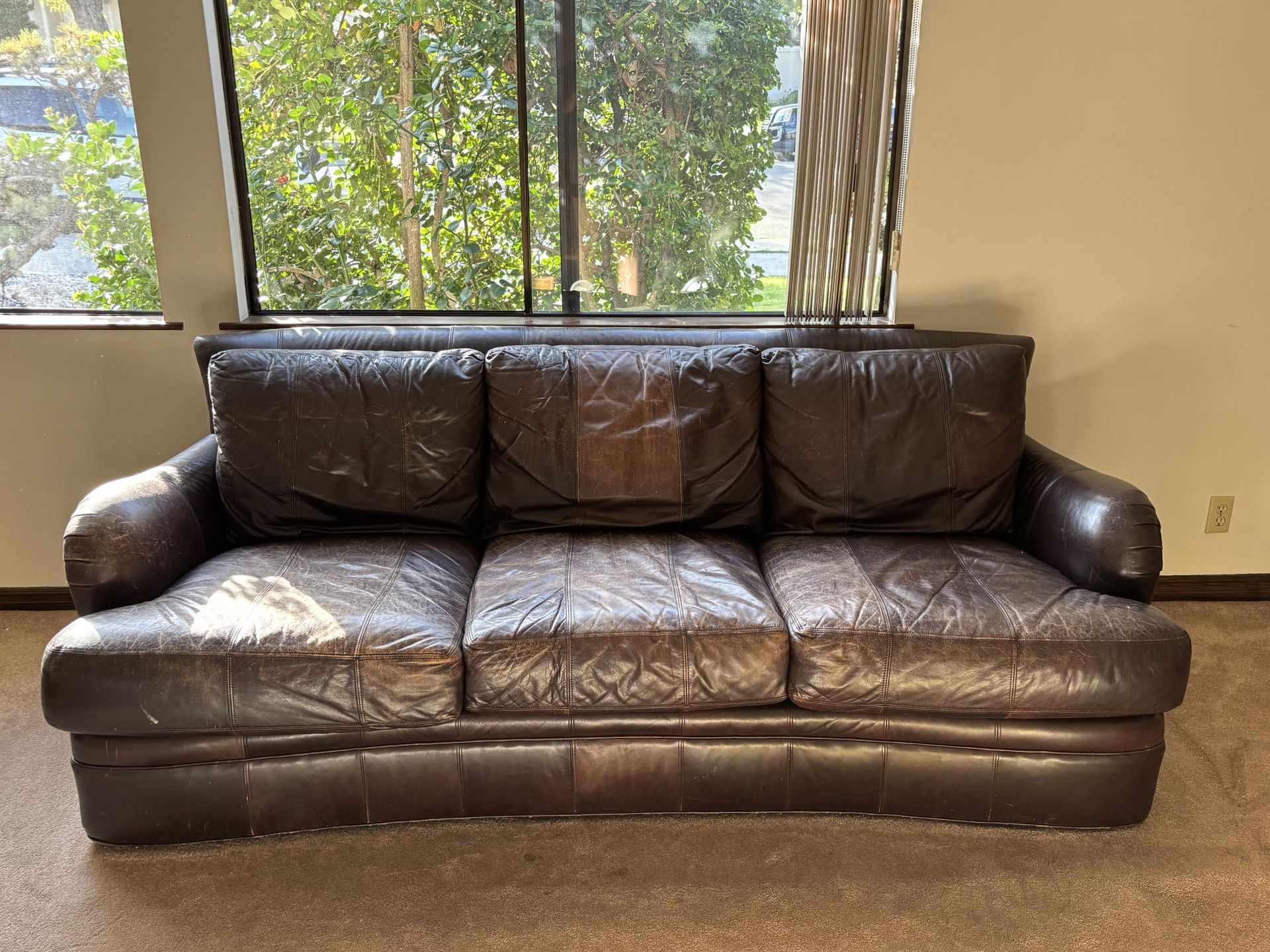 Moving sale! We need it picked up by Friday morning this week before we move. Beautiful leather couch and matching chair with ottoman, handcrafted in North Carolina by Ferguson Copeland Ltd. Made with high-quality full-grain leather, this set is both incredibly durable and comfortable. The couch features a curved back, classic rolled arms with rivet detailing and deep seats. Couch Dimensions: Width: 91” Depth: 36” Height: 33” Diagonal Depth: 50” Chair Dimensions: Width: 37” Overall height: 34” Seat height: 20” Depth: 36” Diagonal depth: 50” Ottoman dimensions: Height: 16” Width: 34” Depth: 28” An application of leather conditioner would bring it back to its original beauty. Local pickup & cash only