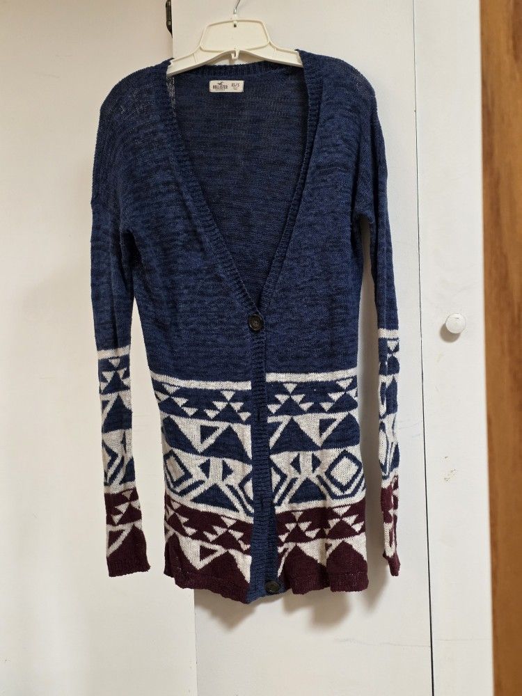 Hollister Southwestern print boyfriend cardigan in blue, white, and burgundy, size s