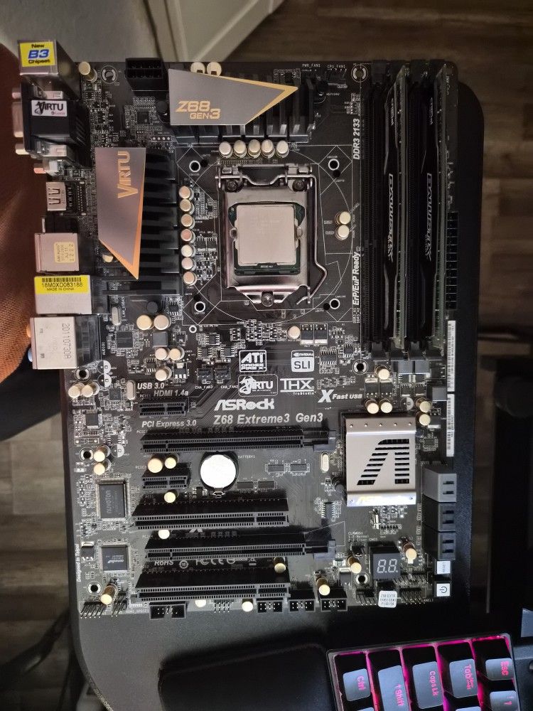 Tested and working motherboard combo. Items exactly as listed, in this age of expensive PC parts, you can get into entry level gaming with a board like this. Asrock z68 extreme3 gen 3 DDR3 motherboard. 2x8GB 1600mhz DDR3 memory crucial ballistix sport matched kit. 9-9-9-24 1.5v 2x8gb 1600mhz DDR3 memory G Skill Trident X matched kit 7-8-8-24 1.5v Intel core i7 3770k slight OC to 4.2ghz 1.275v with memory clocked to 2133mhz. Tested stable. 70+fps Marvel Rivals high settings native 1080p (paired with 1070 ti) Willing to negotiate... Don't be weird!