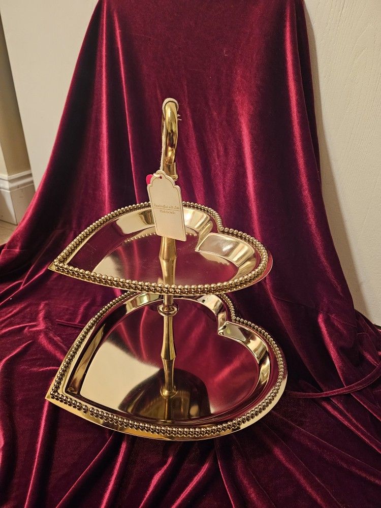 Brand new 2 teir heart dessert tray. Strudy and has so weight to it. Made entirallg of metal. Gold in color with bead like details on edges. Large