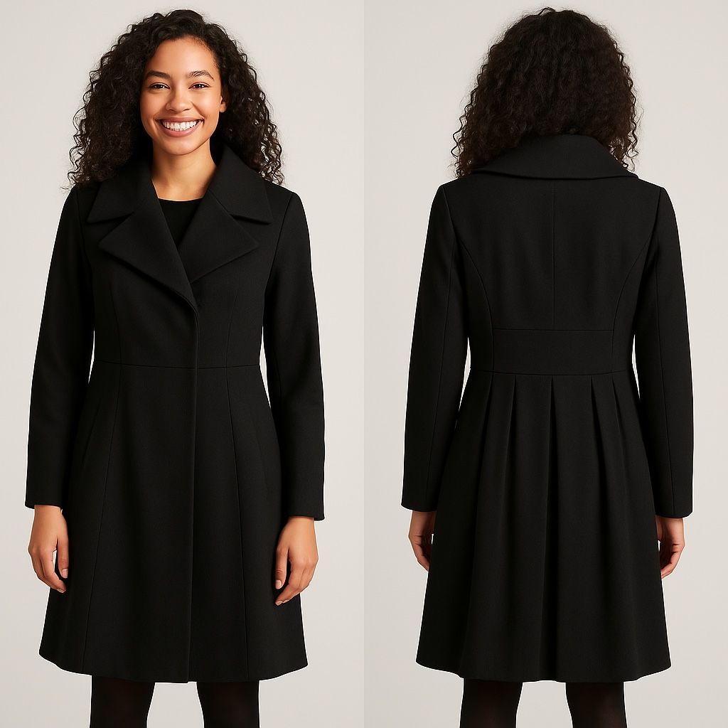 Nine West Black Wool-Blend Pleated-Back Coat – Size 10