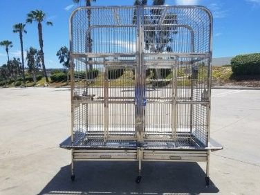 Huge all stainless 304 super high quality breeder cage. Reg 2499 selling for 2K FEATURES: High Quality #304 Stainless Steel! Lasts many times longer than standard cages (Even other #430SS cages) 1 Inch Bar Spacing (Recommended for larger birds) Measurements: Overall Size: 63.5" Tall x 58" Wide (with seed catcher) x 32" Deep (with seed catcher). Width without seed catcher is 58". Depth without seed catcher is 24". Not including stand, actual cage is: 52" Tall x 24" Deep x 50.5" Wide. With divider in place, each side is 52" Tall x 24.5" Wide x 24" Deep. Each door opening is 26.5" Tall x 10" Wide. Food bowls are 5" diameter. (3 included, but a spot for a 4th) Thick ~5mm Stainless Steel Bars (Many others 2-3mm which break easily) Easy Swing Open Food / Water Bowls (3 x 5" bowls included, but 4 available spots) Secondary lock on each front door, to prevent door from accidentally opening. Safety lock for center divider to prevent it from sliding open. 2 Wooden Perches Included 6 Wheels included to make it easy to move
