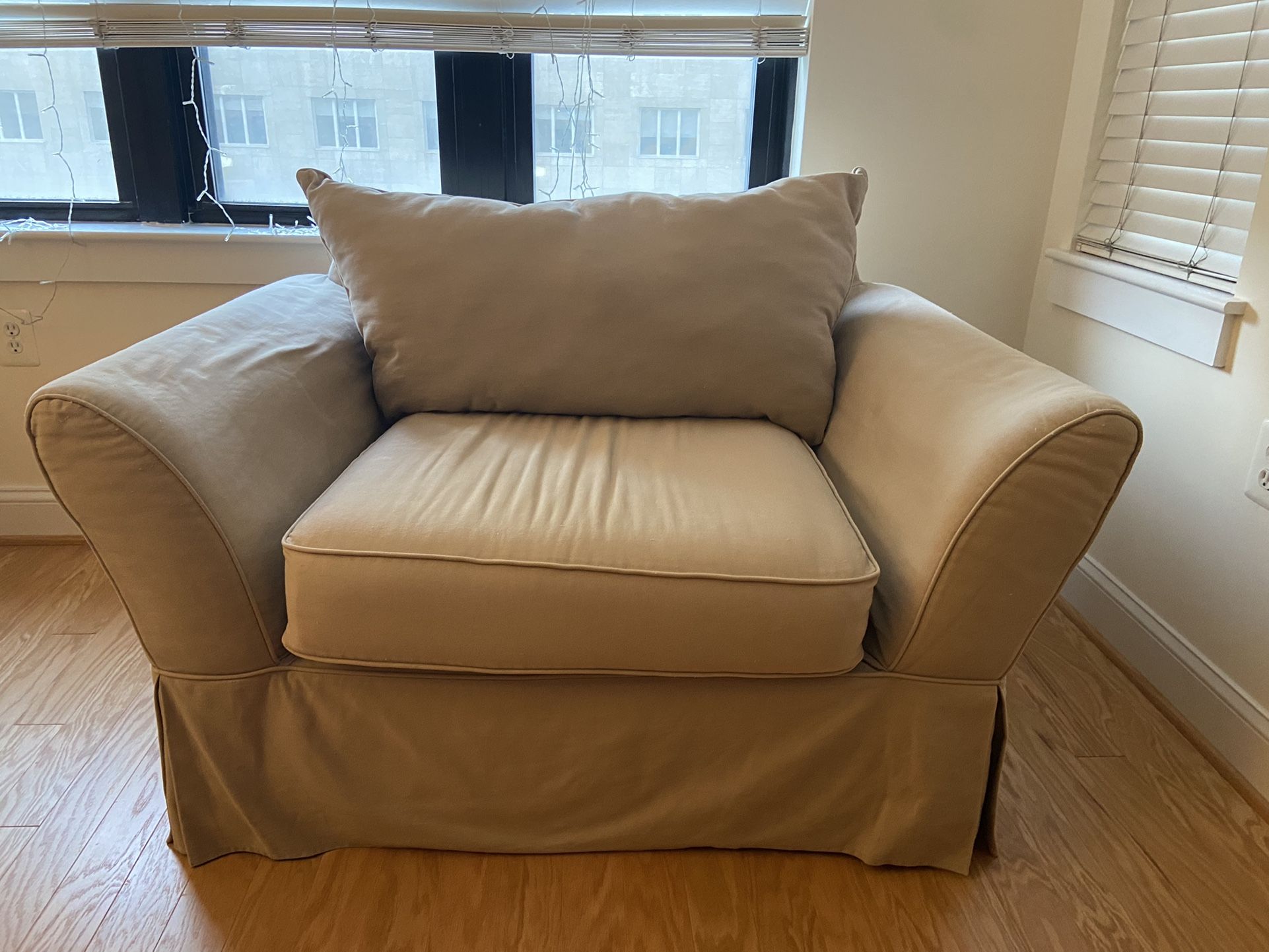 Very comfy oversized armchair in light beige. Some wear and tear on slipcover. Slipcover is removable from washing. Comes from a home with a cat! Pickup only.