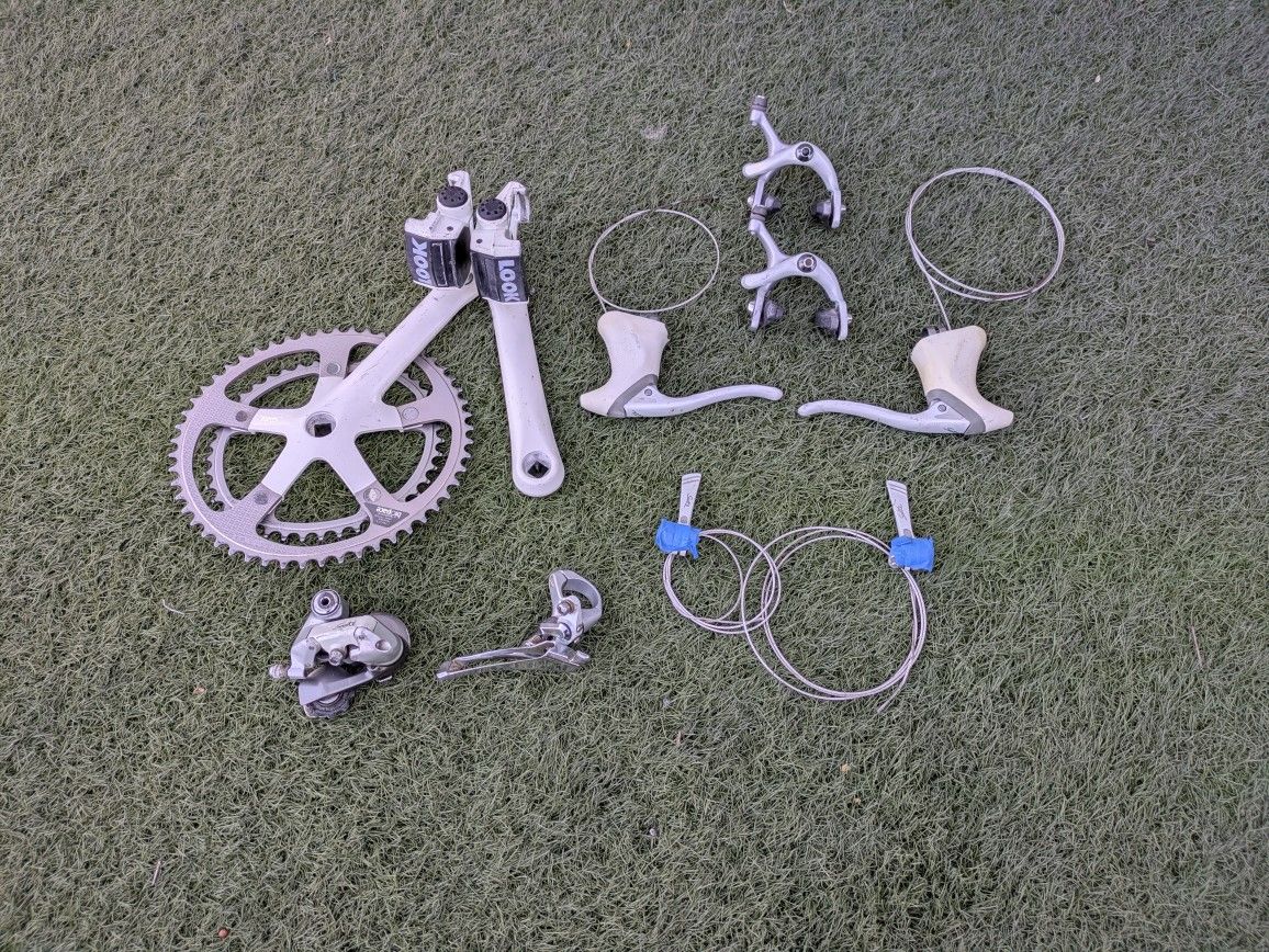 Very good condition 1988 Shimano Sante 5000 groupset. Perfect for your vintage road bike build. Some minor scuffs as shown in pics, but overall very clean and 100% mechanically. Crankset has170mm arms and the chainrings are 53/42. Includes the Look pedals because I wasn't able to remove them. They are in good shape too, or you can try your luck at removing them. Locals pickup in San Diego 92129, or can ship for an extra $30