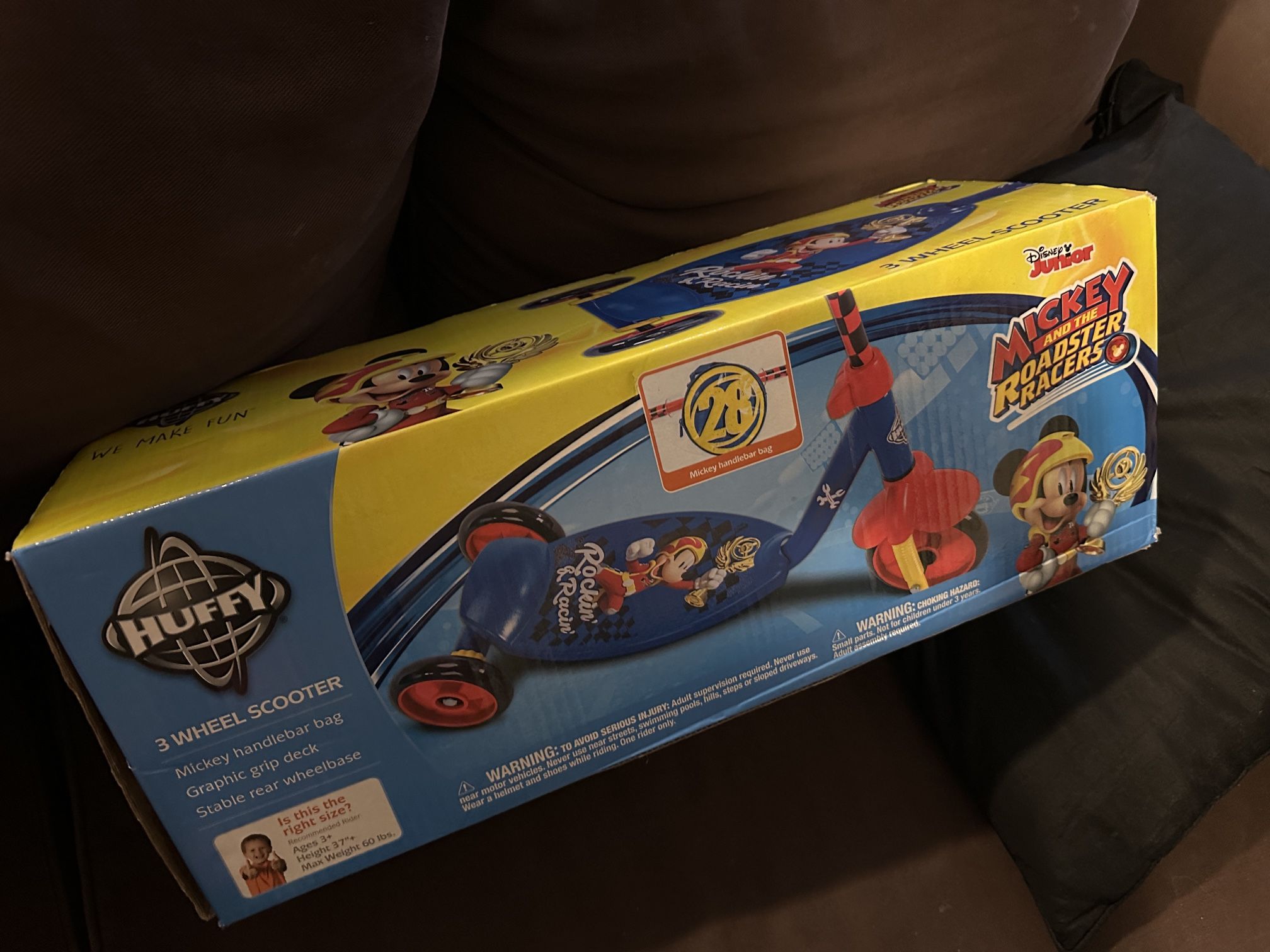 Huffy Mickey Mouse scooter for ages 3+ with max weight of 60lbs. My son already had a scooter and we never got around to using this one. Brand new, never opened. $40