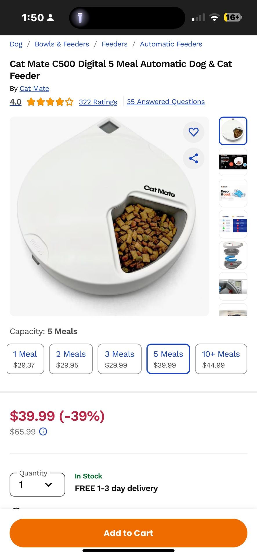 The digital timer lets you control when your dog or cat gets to eat, while the tamper-resistant lid keeps food secure between meals. The LCD screen clearly displays all programmed mealtimes to help you keep track of feeding schedules. The bowl and lid are dishwasher safe for easy cleaning. Ideal for feeding multiple pets or offering controlled portions to 1 dog or cat. Compatible with both wet and dry foods, this feeder comes with twin ice packs to help keep your pet’s meals fresh throughout the day. Keep your pal’s meals regular with the Cat Mate C500 Digital 5 Meal Dog & Cat Feeder. It’s designed to let you easily control when your cat or dog gets to eat. Simply set up the meal times using the digital timer and it will only dispense food at your set times―plus, you can see all the programmed meals on the LCD display. It features five compartments to hold up to five meals for small dogs and cats alike, a close-fitting, tamper-proof lid, and twin ice packs to keep the food fresh. And keeping it clean is easy since the lid and bowl are dishwasher safe. It’s been used like maybe once just been sitting in storage.